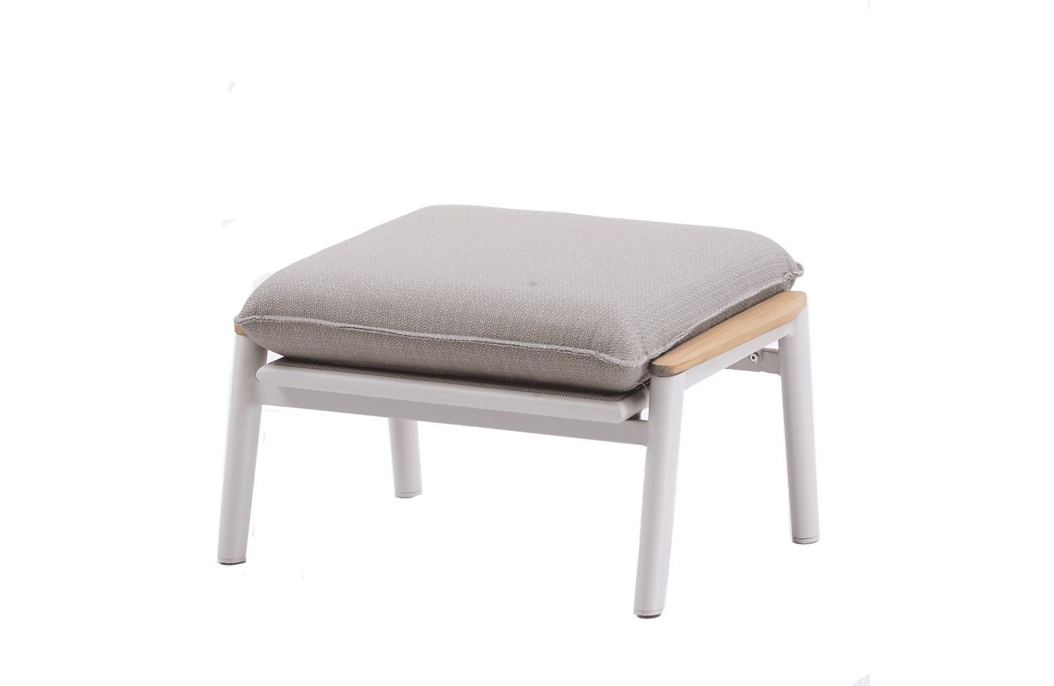 The powder-coated stainless steel frame in beige is complemented by elegant teak wood armrest details, adding warmth and refinement.