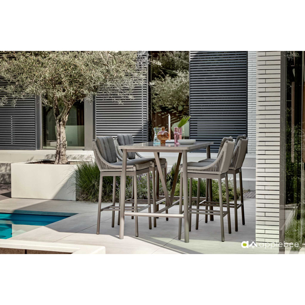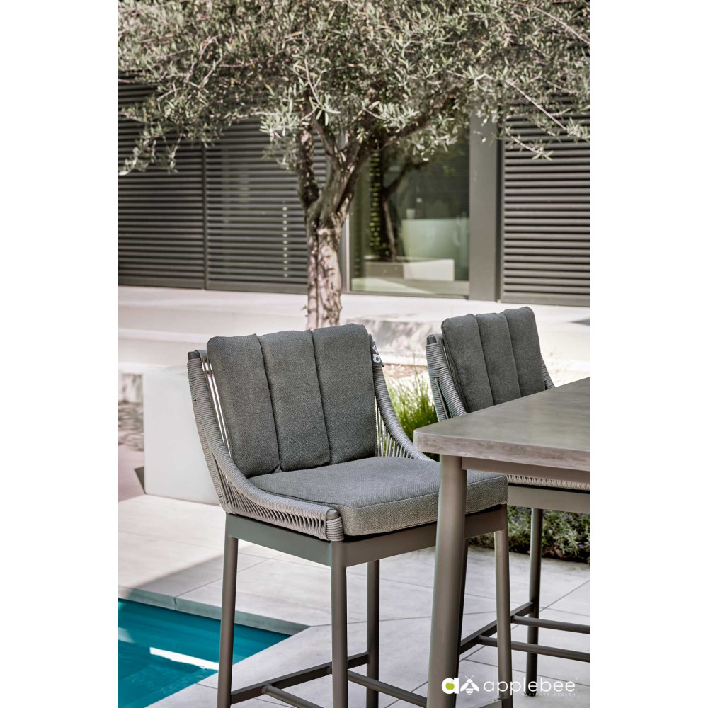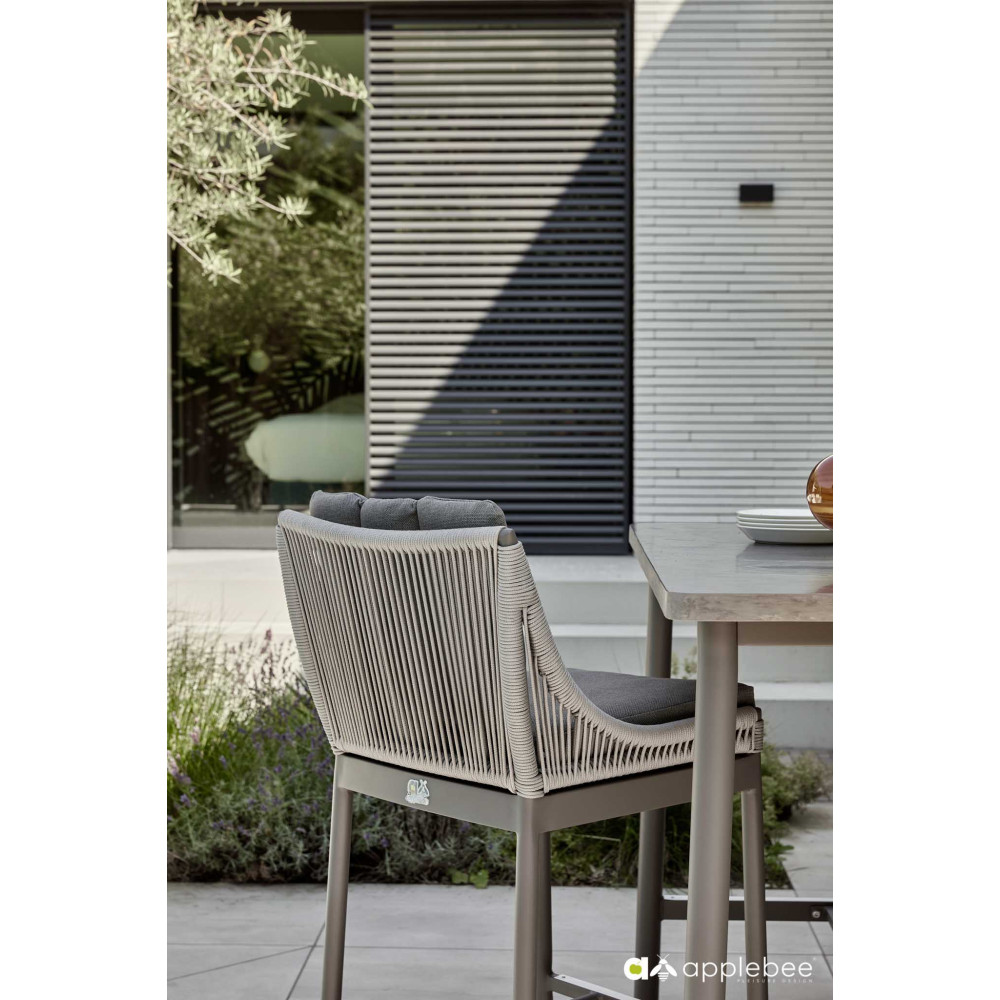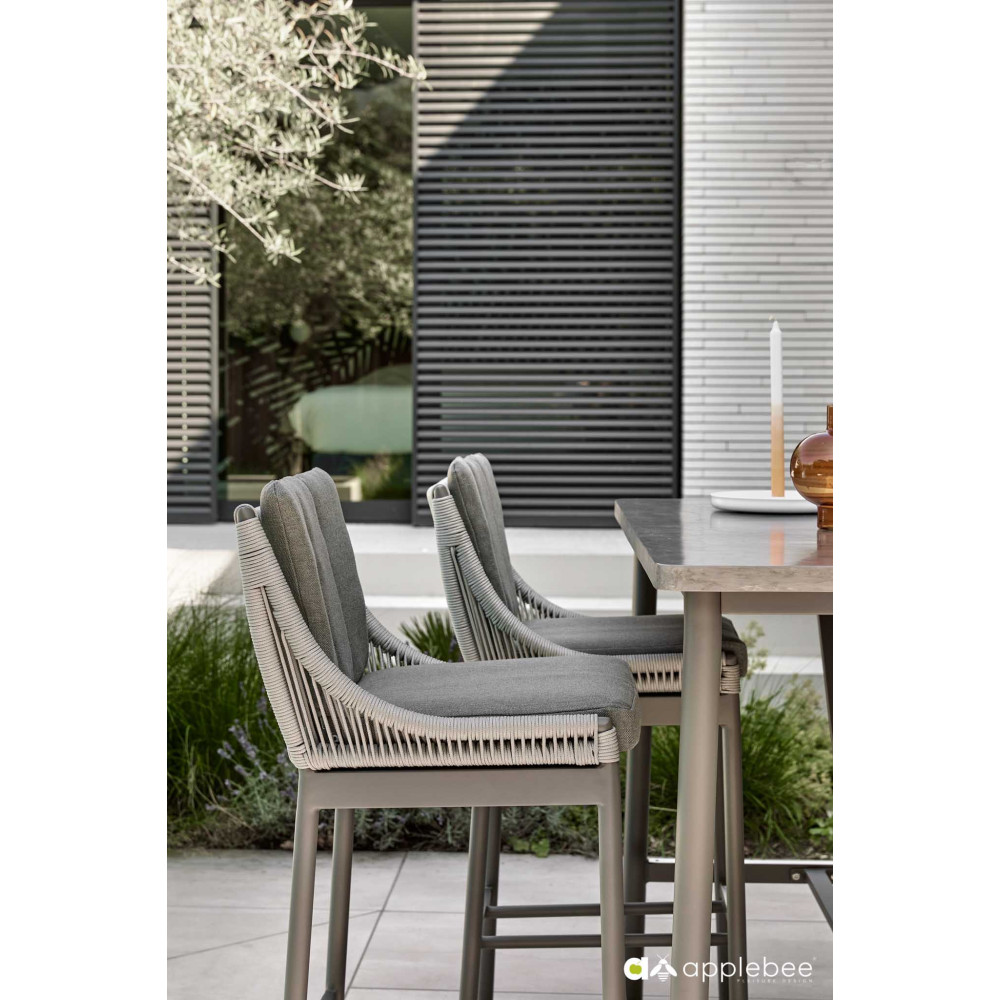 With the Bijou Dining bar set, you can enjoy a stylish outdoor lunch! Bijou bar stools feature distinctive curved lines on a grey-brown aluminium frame. The stools are woven around the frame with grey polypropylene rope. The armrests and backrest feature two layers of vertical weaving, which is characteristic of the Bijou collection.