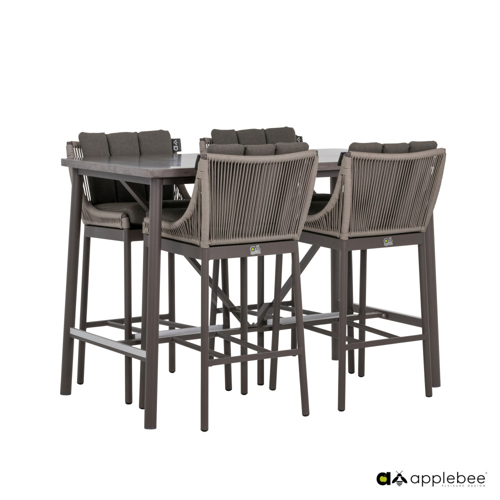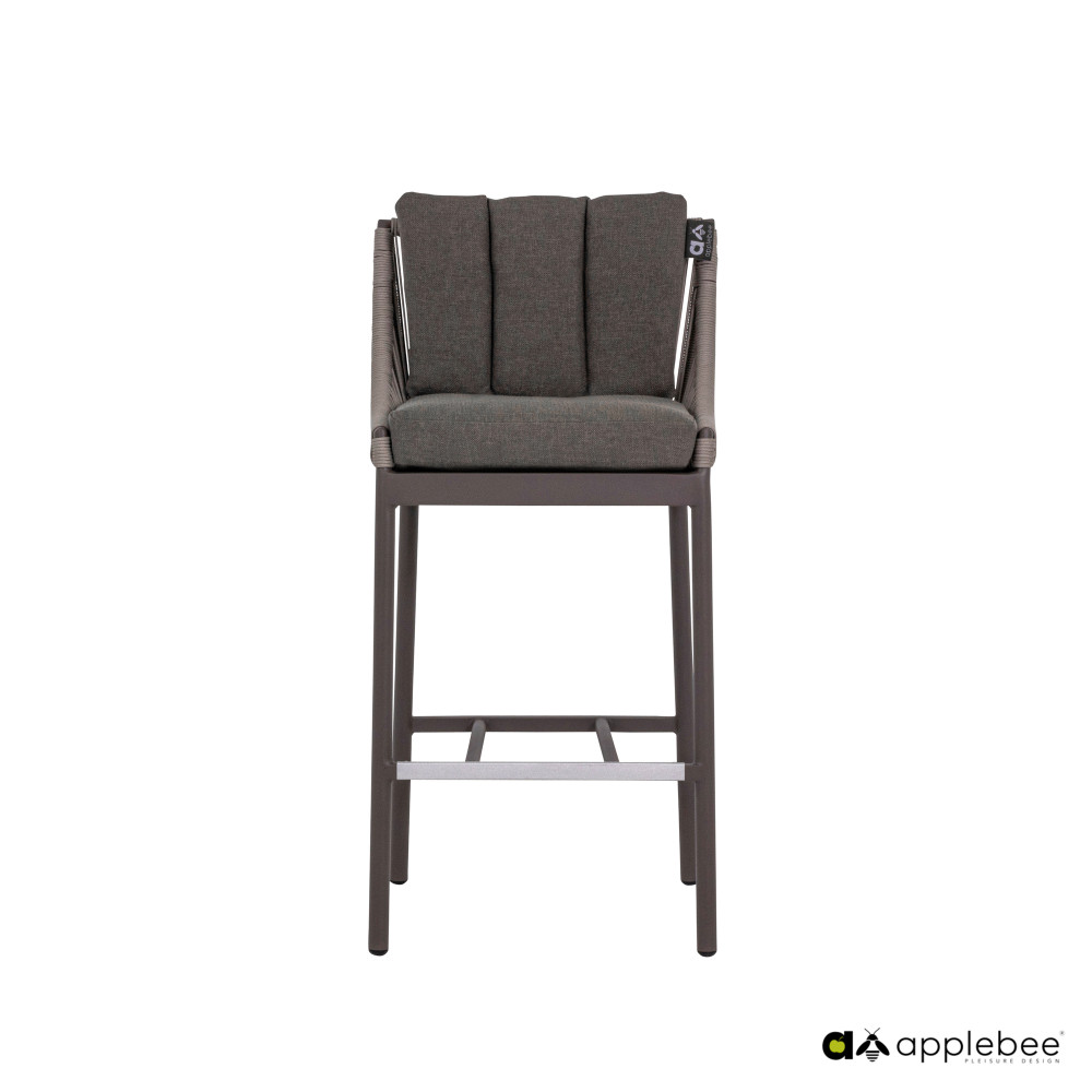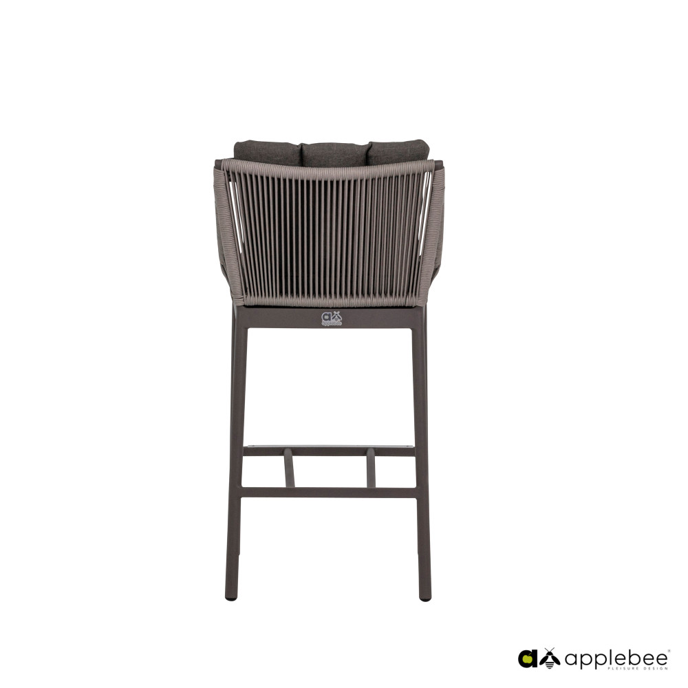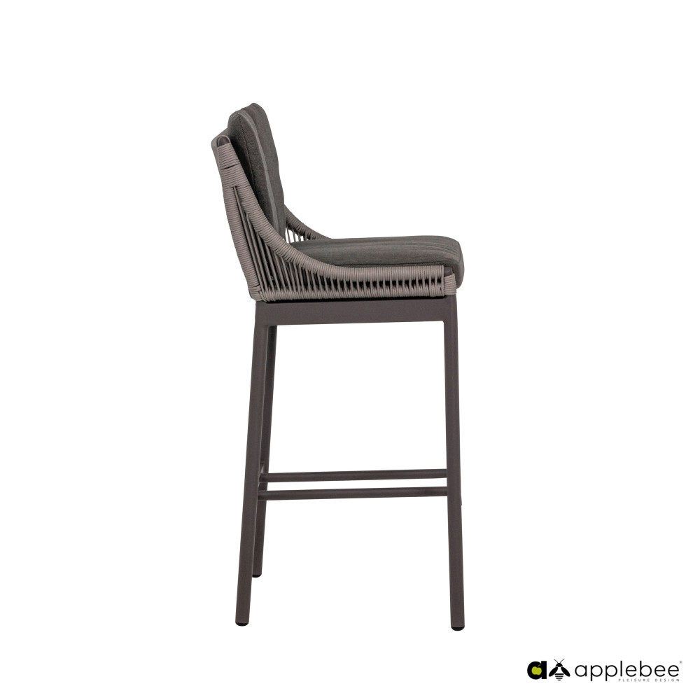 With the Bijou Dining bar set, you can enjoy a stylish outdoor lunch! Bijou bar stools feature distinctive curved lines on a grey-brown aluminium frame. The stools are woven around the frame with grey polypropylene rope. The armrests and backrest feature two layers of vertical weaving, which is characteristic of the Bijou collection.