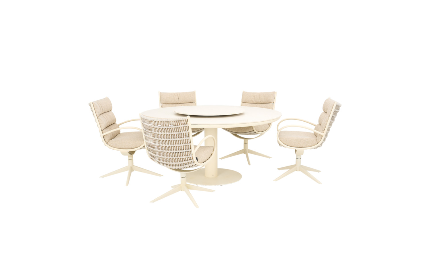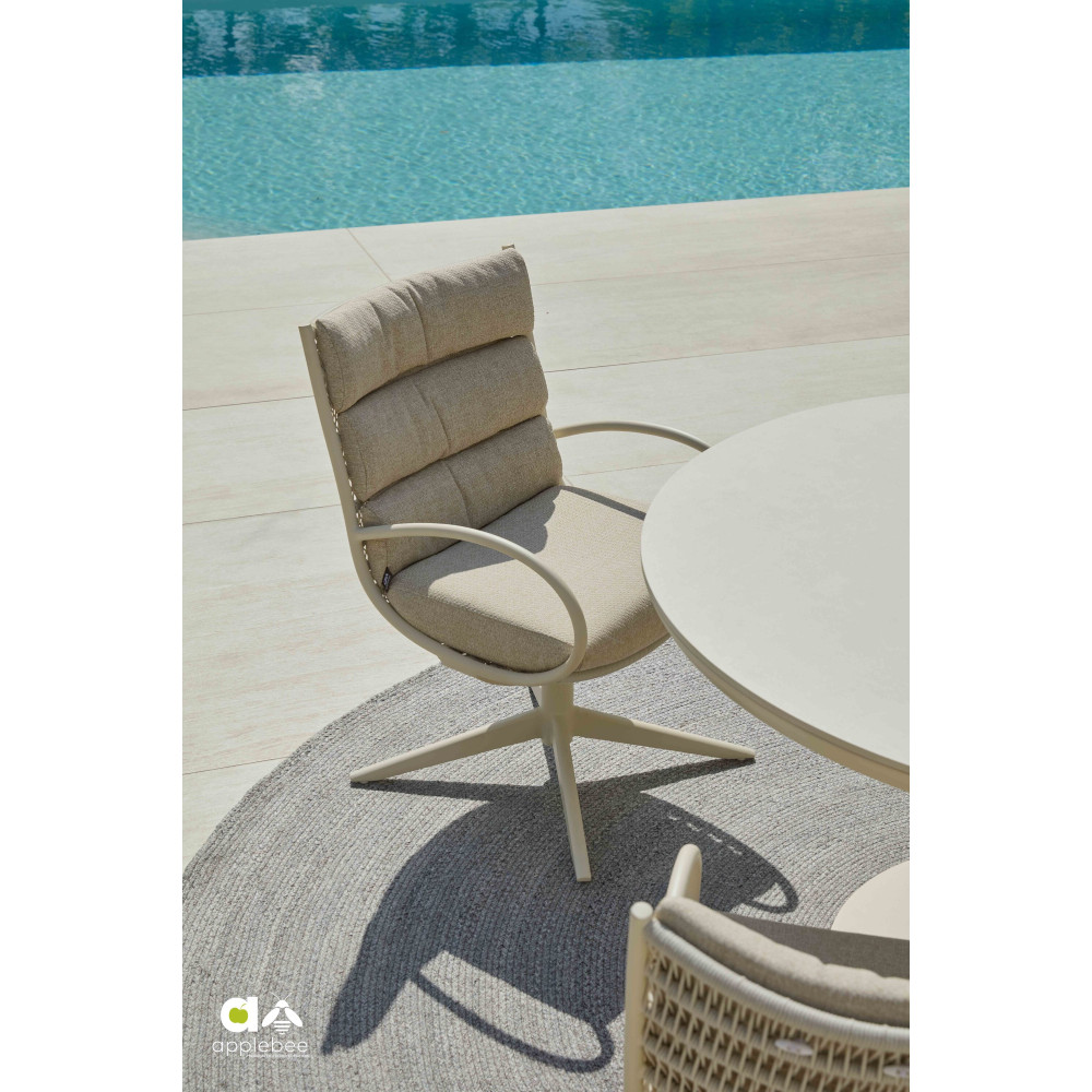 CAMP BAY lounge-dining chair is equipped with a swivel base, allowing you to sit down and stand up easily without moving the chair. The construction is made of high-quality metal and complemented by refined open weaving Biculair®, which gives the product a light and airy appearance.
