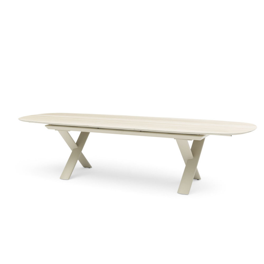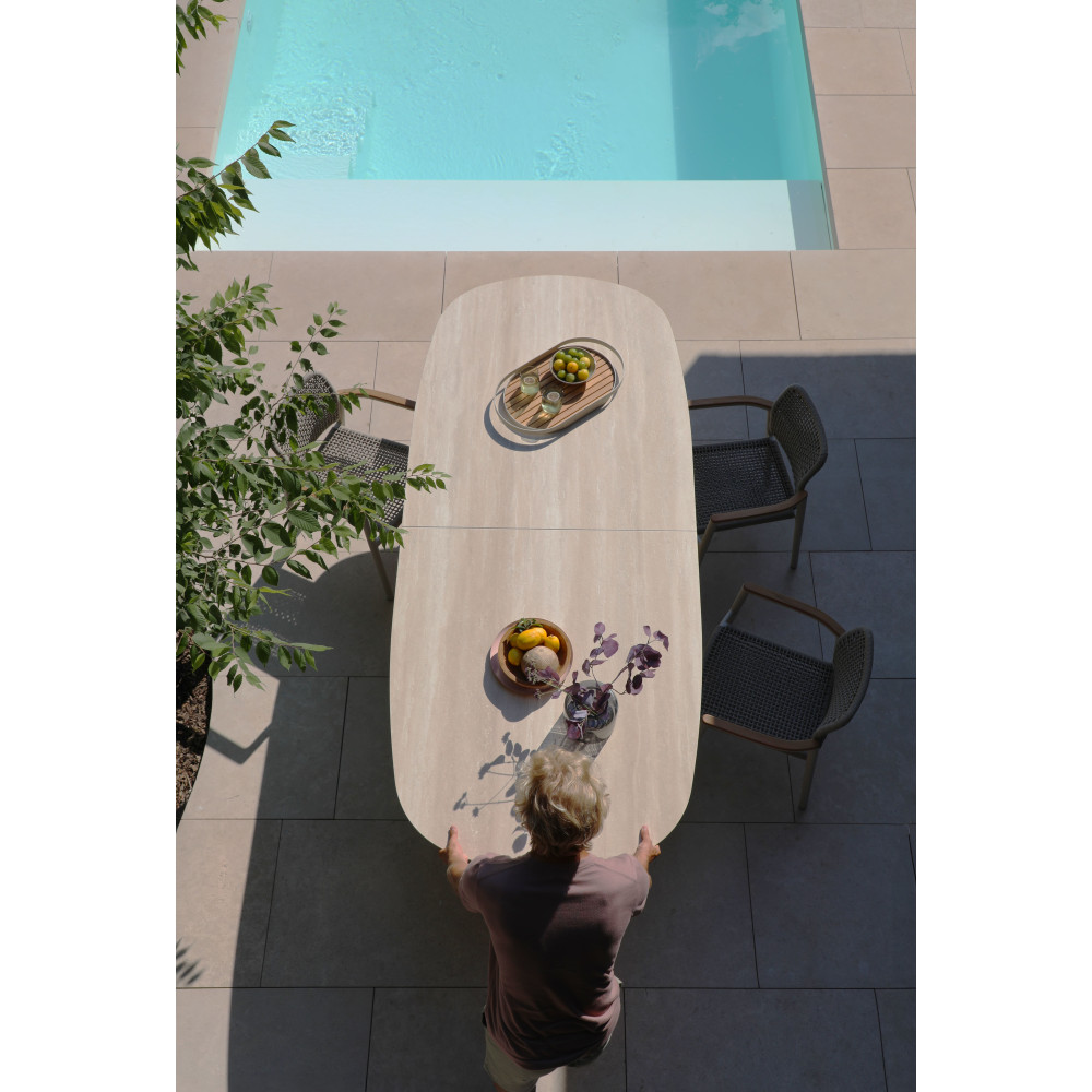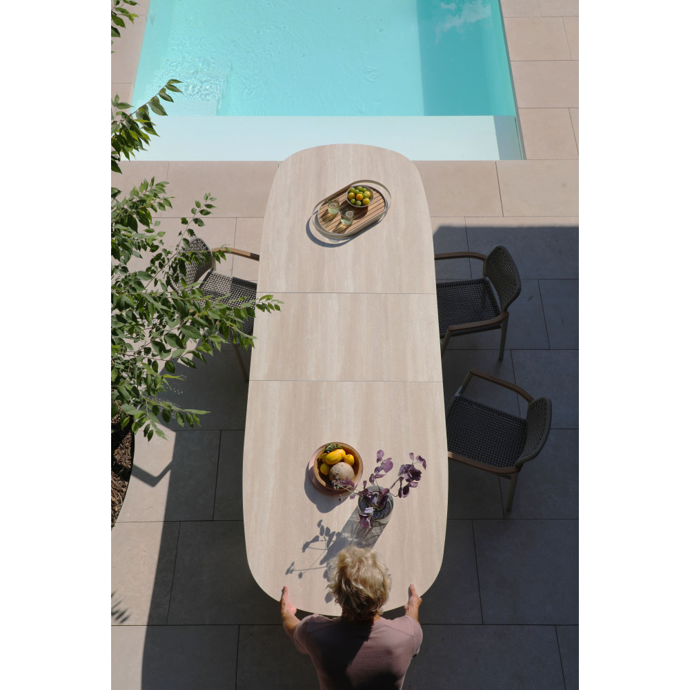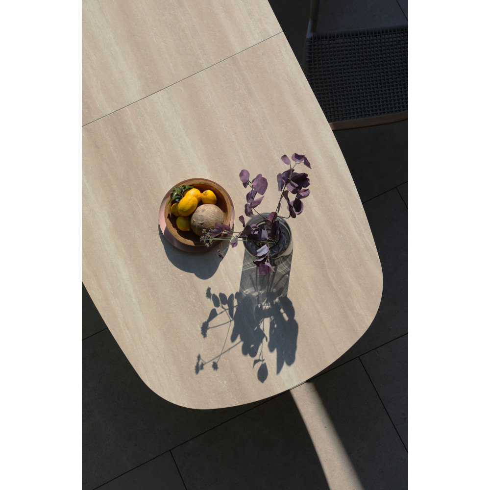 The Albatros table collection blends modern design and functionality with an extension mechanism and durable materials. The base features an aluminum frame with Tiger® powder coating, while the tabletop is made of 6 mm ceramic, ensuring durability and weather resistance.