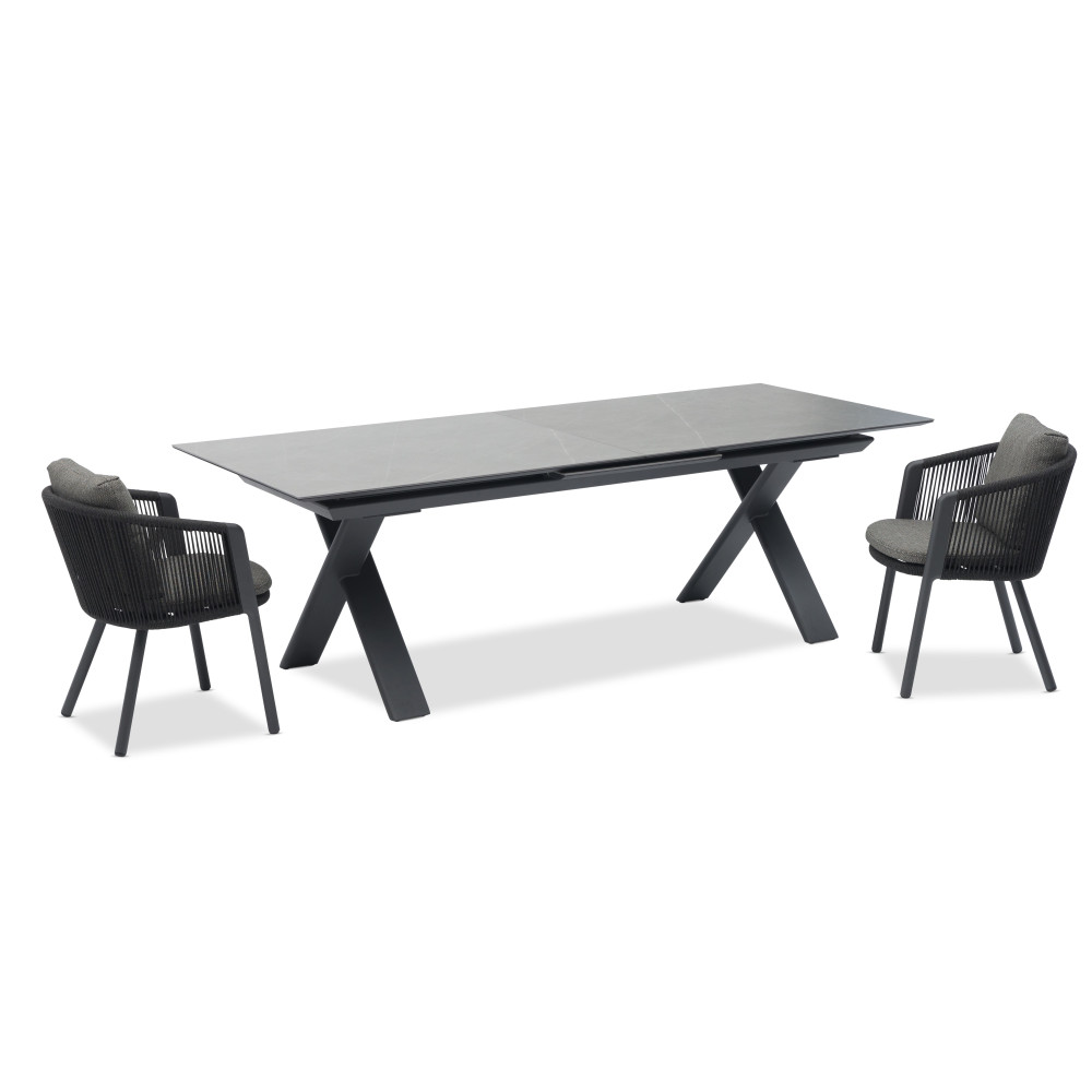 The Albatros table collection blends modern design and functionality with an extension mechanism and durable materials. The base features an aluminum frame with Tiger® powder coating, while the tabletop is made of 6 mm ceramic, ensuring durability and weather resistance.
