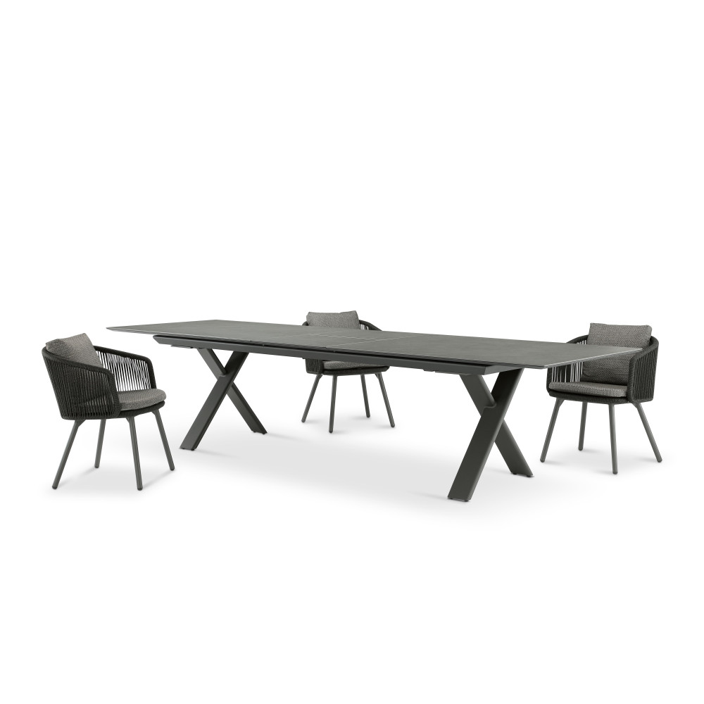 The Albatros table collection blends modern design and functionality with an extension mechanism and durable materials. The base features an aluminum frame with Tiger® powder coating, while the tabletop is made of 6 mm ceramic, ensuring durability and weather resistance.