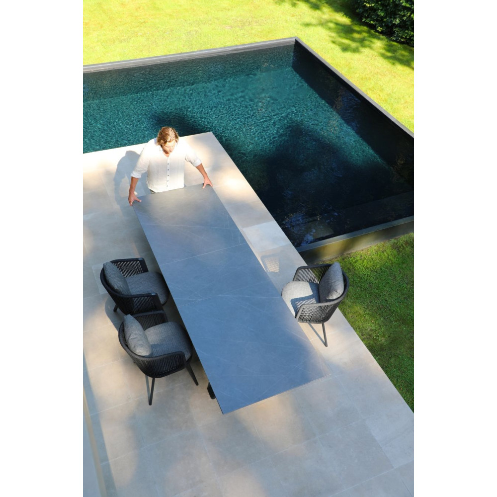 The Albatros table collection blends modern design and functionality with an extension mechanism and durable materials. The base features an aluminum frame with Tiger® powder coating, while the tabletop is made of 6 mm ceramic, ensuring durability and weather resistance.
