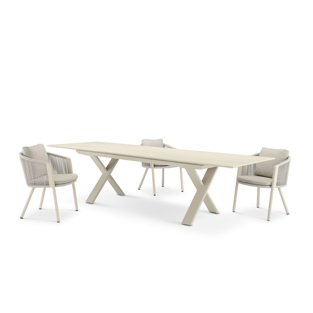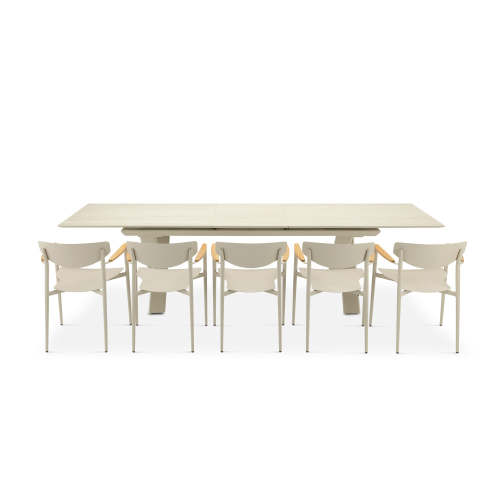 The Albatros table collection blends modern design and functionality with an extension mechanism and durable materials. The base features an aluminum frame with Tiger® powder coating, while the tabletop is made of 6 mm ceramic, ensuring durability and weather resistance.