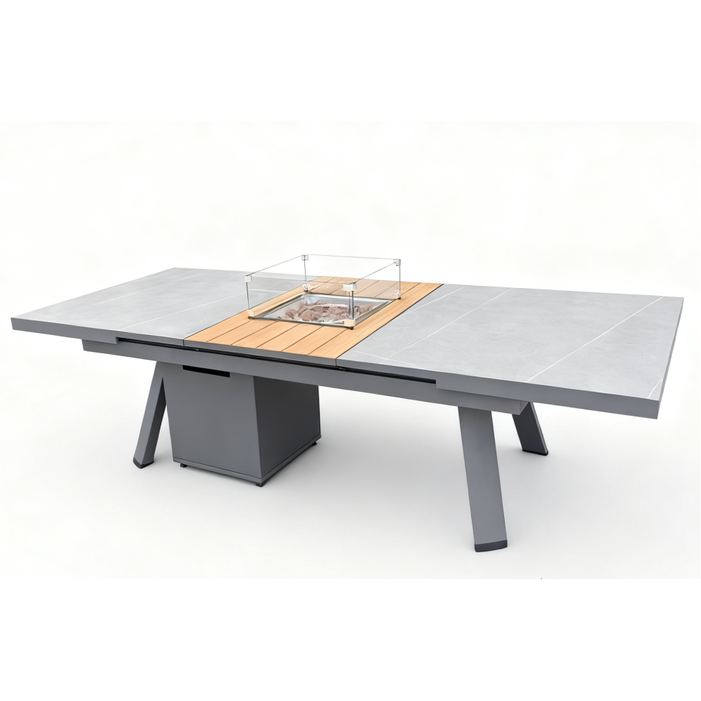 The key feature of the Fueggo collection is the integrated gas fireplace built into the table, which creates a pleasant atmosphere even on cooler evenings.