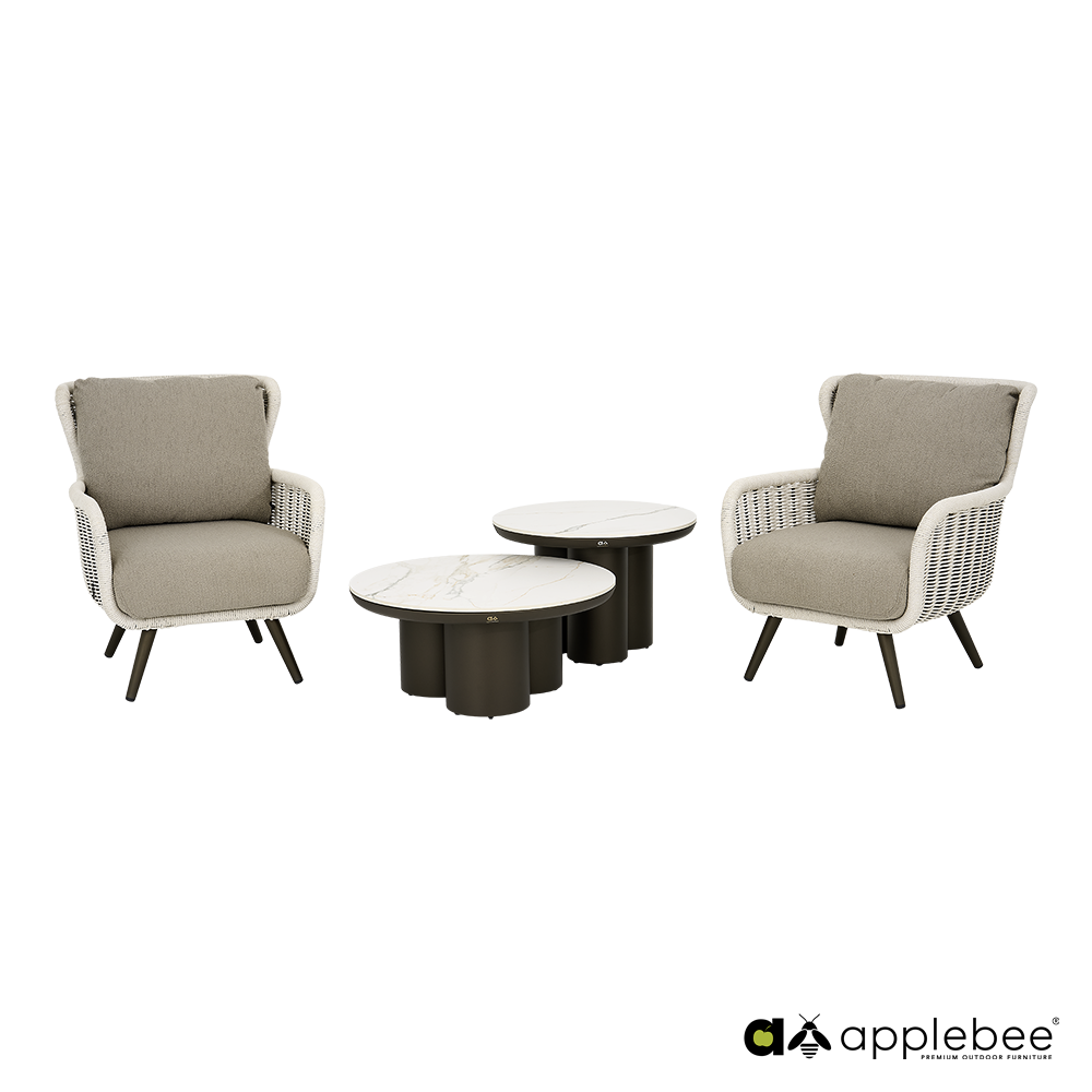 Key Largo by Apple Bee combines the warmth of Bronze, the elegance of Biculair® Twisted Ivory weaving, and the sophistication of sintered stone marble — creating a durable and stylish lounge setting for modern outdoor living.
