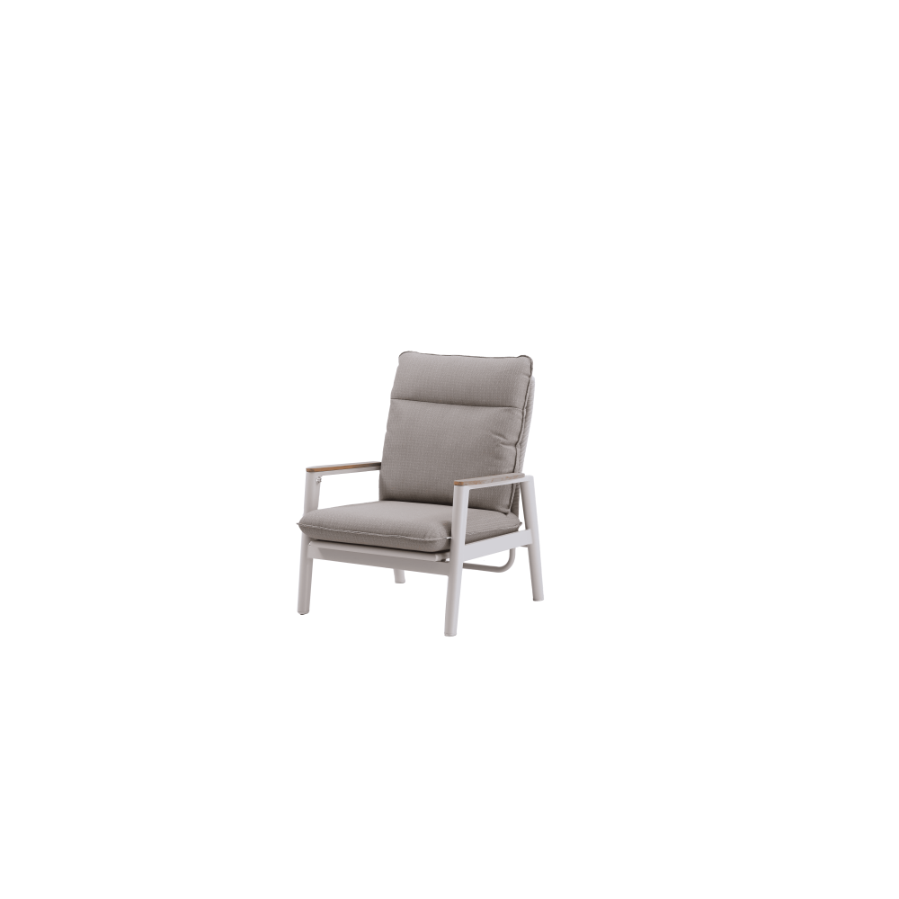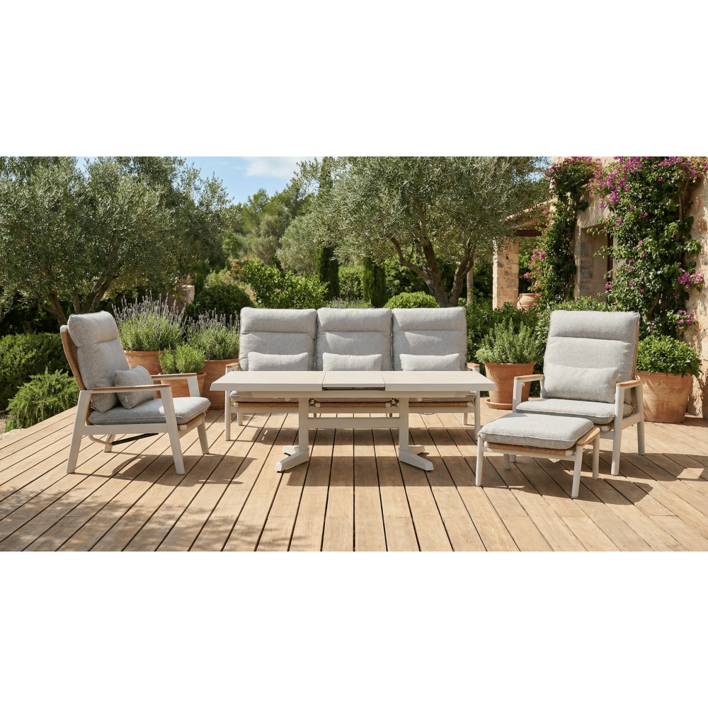 The powder-coated stainless steel frame in beige is complemented by elegant teak wood armrest details, adding warmth and refinement.