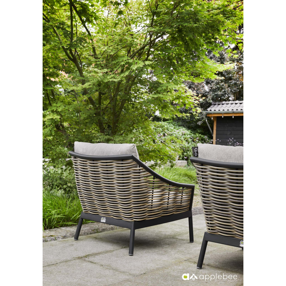 The Apple Bee Milou weave resembles willow branches. This weave is framed by a black powder-coated frame with curved lines, giving Milou its luxurious, contemporary look. The frame is usually hidden under the weave. For Milou, designer Sako Viima framed the weave in a frame. This makes the furniture particularly interesting.