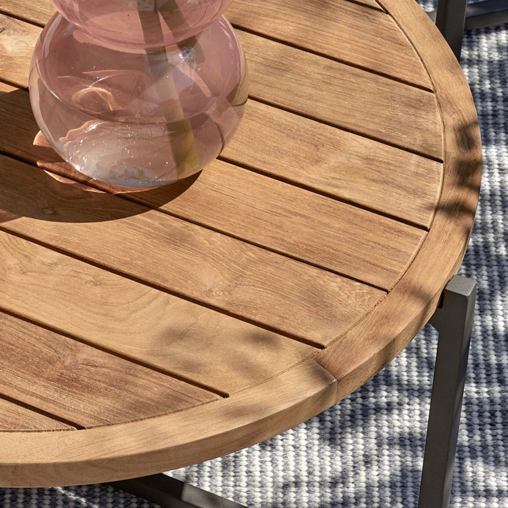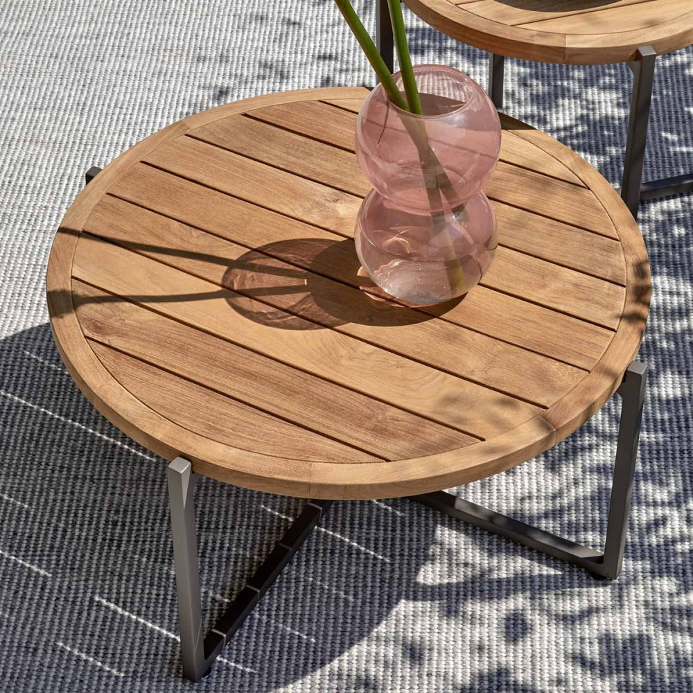Teak tabletop. Each leaf is unique and may vary slightly in structure. The coffee table can be used both indoors and outdoors, but especially in combination with the other pieces in the Condor series.