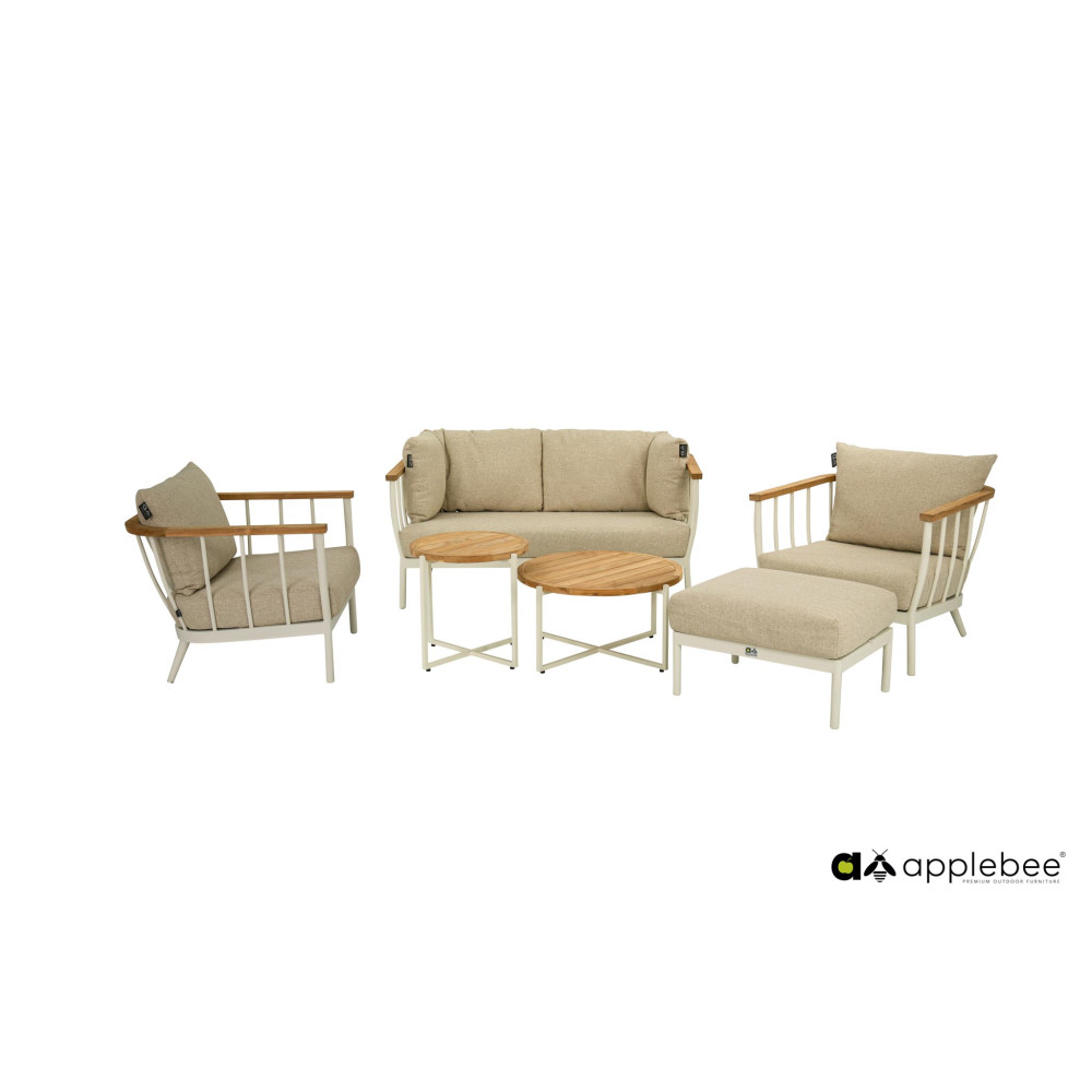 The Condor coffee table from Apple Bee is fully in line with Apple Bee's new styles, featuring an aluminium frame in OYSTER (TAUPE) and a teak tabletop.