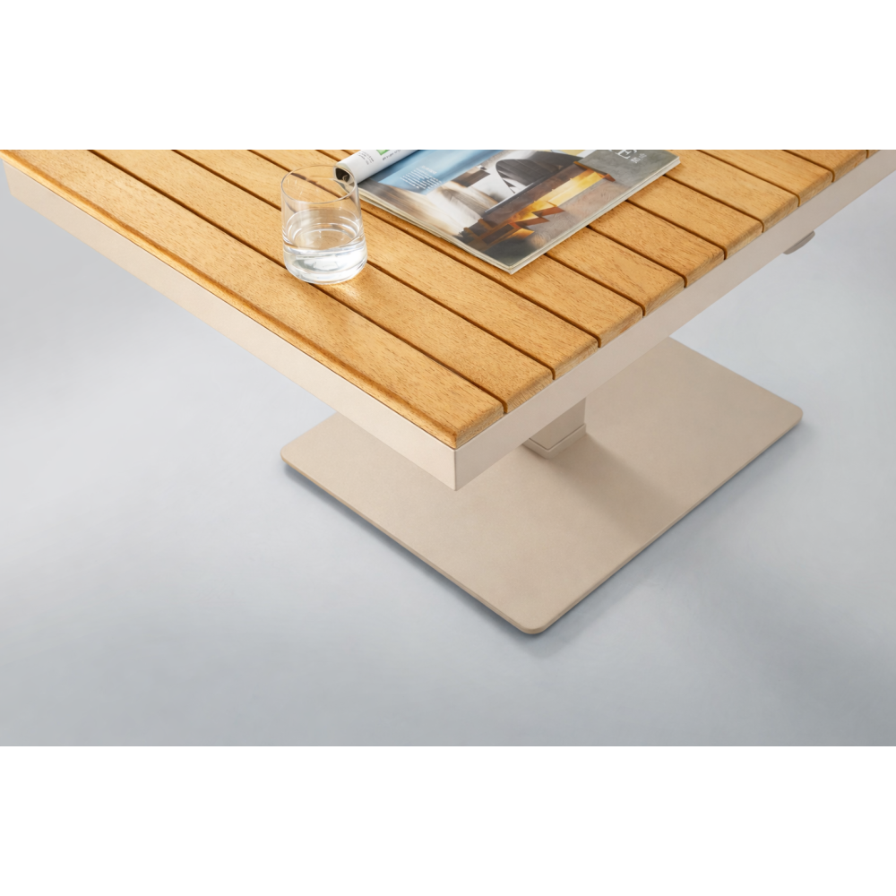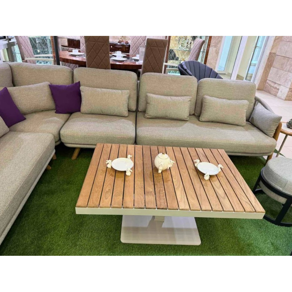 The Emoti set is one of the brand’s outstanding offerings, combining an aluminum frame that provides lightness and durability, teak wood that delivers natural charm and weather resistance, and polyester cushions that ensure comfortable relaxation.
