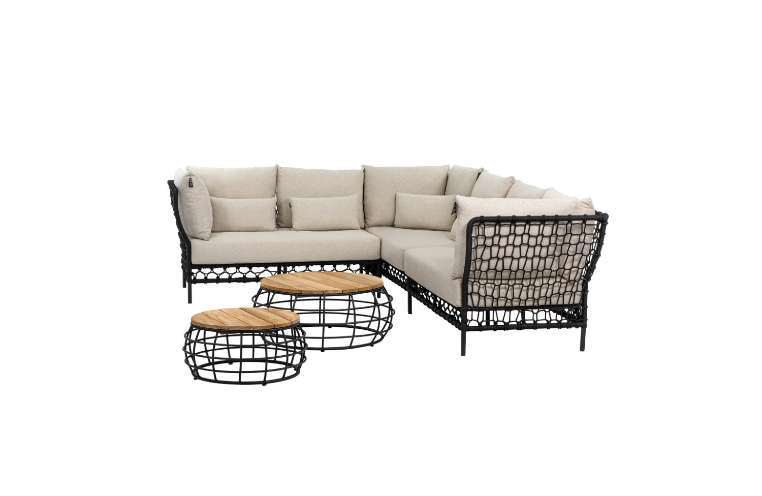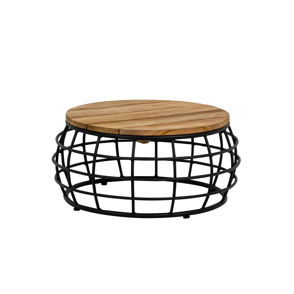 The round coffee tables have a teak wood top with an open aluminium frame.