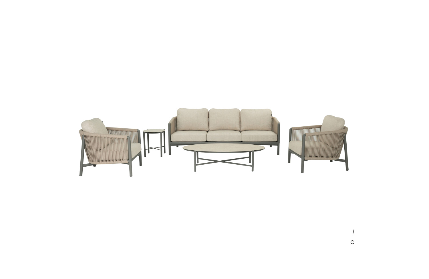 The frame is made of powder-coated aluminum in taupe or natural bronze finishes. The material is corrosion-resistant, weatherproof, and suitable for year-round outdoor use. Backrests and side panels are finished with UV-resistant synthetic rope weaving, adding texture and visual lightness. Lounge and dining tables feature natural teak tabletops, which develop a refined patina over time.