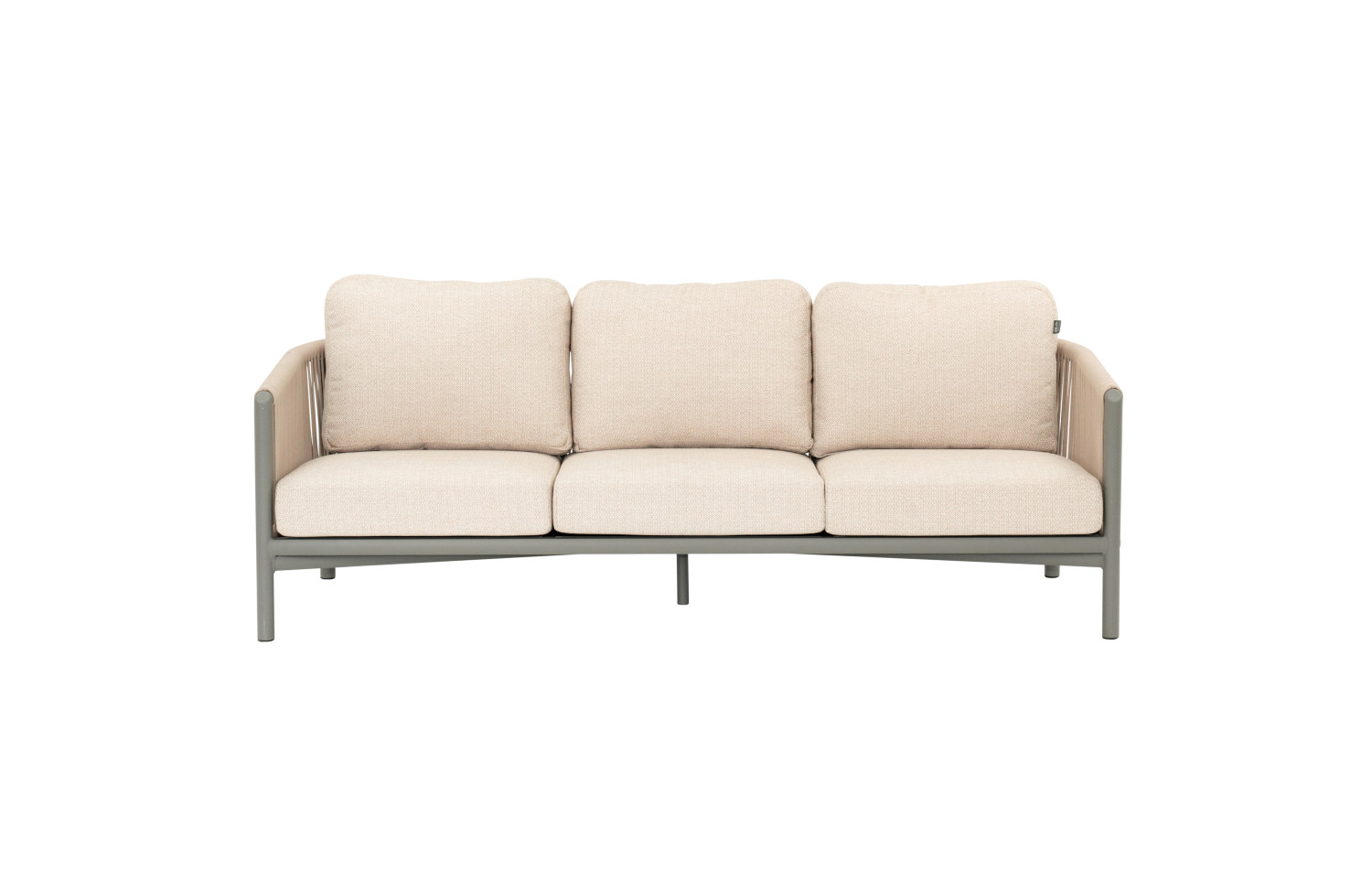 The frame is made of powder-coated aluminum in taupe or natural bronze finishes. The material is corrosion-resistant, weatherproof, and suitable for year-round outdoor use. Backrests and side panels are finished with UV-resistant synthetic rope weaving, adding texture and visual lightness. Lounge and dining tables feature natural teak tabletops, which develop a refined patina over time.