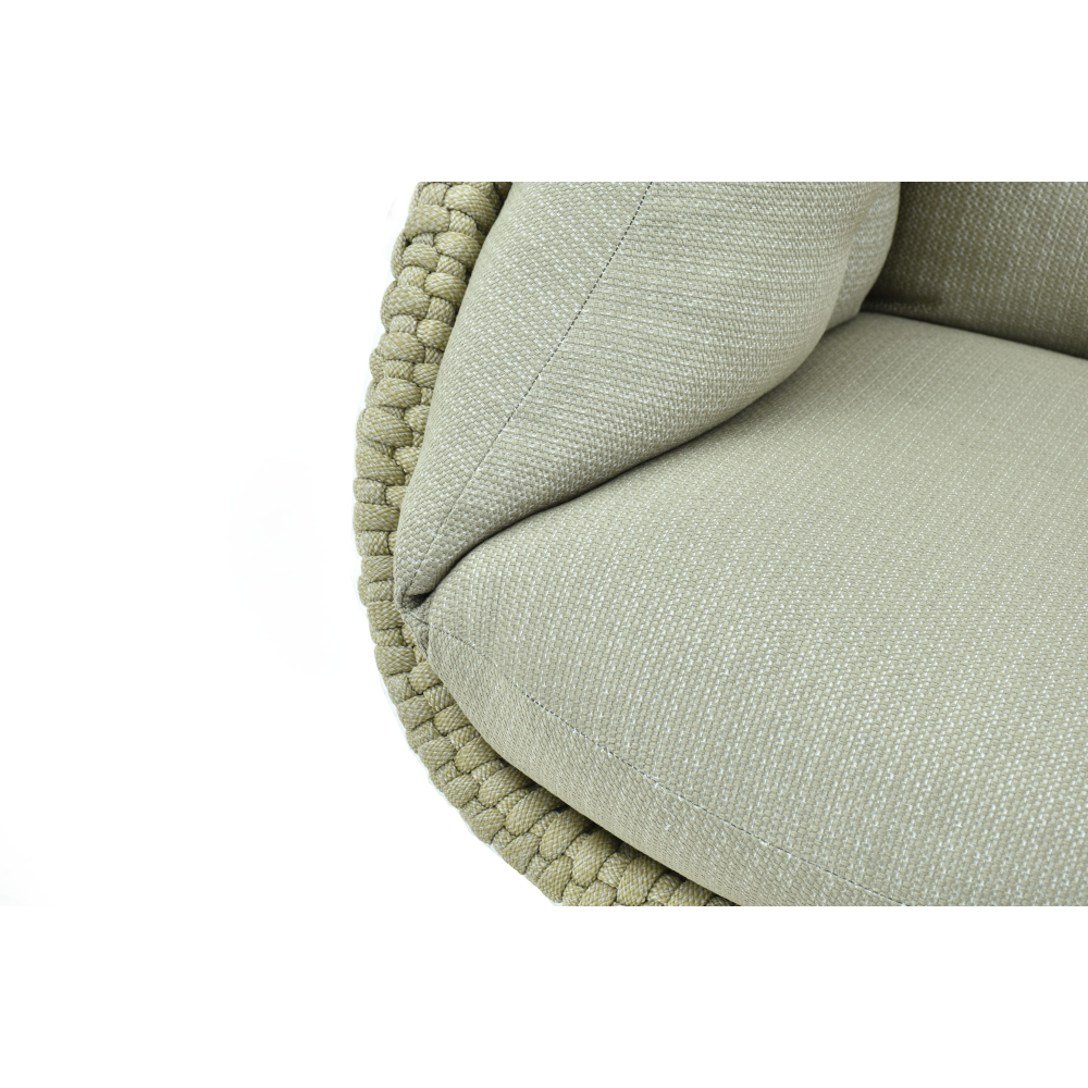 The solid yet visually lightweight construction is made of powder-coated aluminum, ensuring durability, corrosion resistance, and UV protection. The acrylic rope woven backrest adds a distinct graphic character and comfortable support.