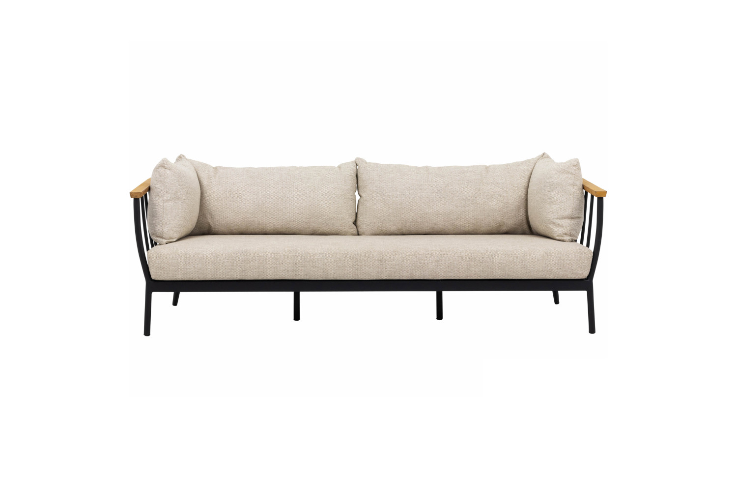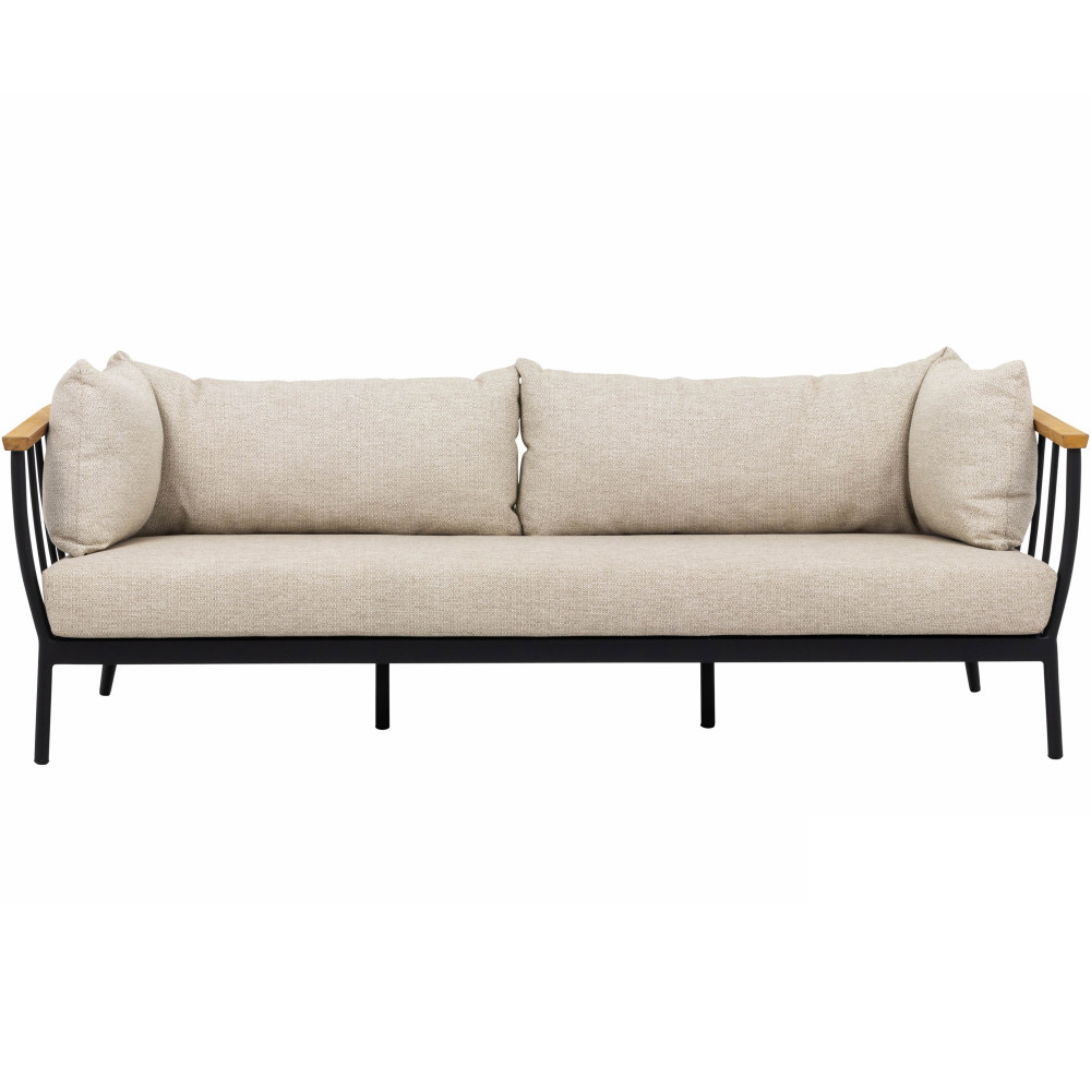 The Condor three-seater sofa for the living room is a sturdy, modern sofa for relaxation. The black accents of the sofa create a sleek and modern design, but the rounded shapes and warmth of teak wood make the sofa very contemporary and fully in line with current trends.