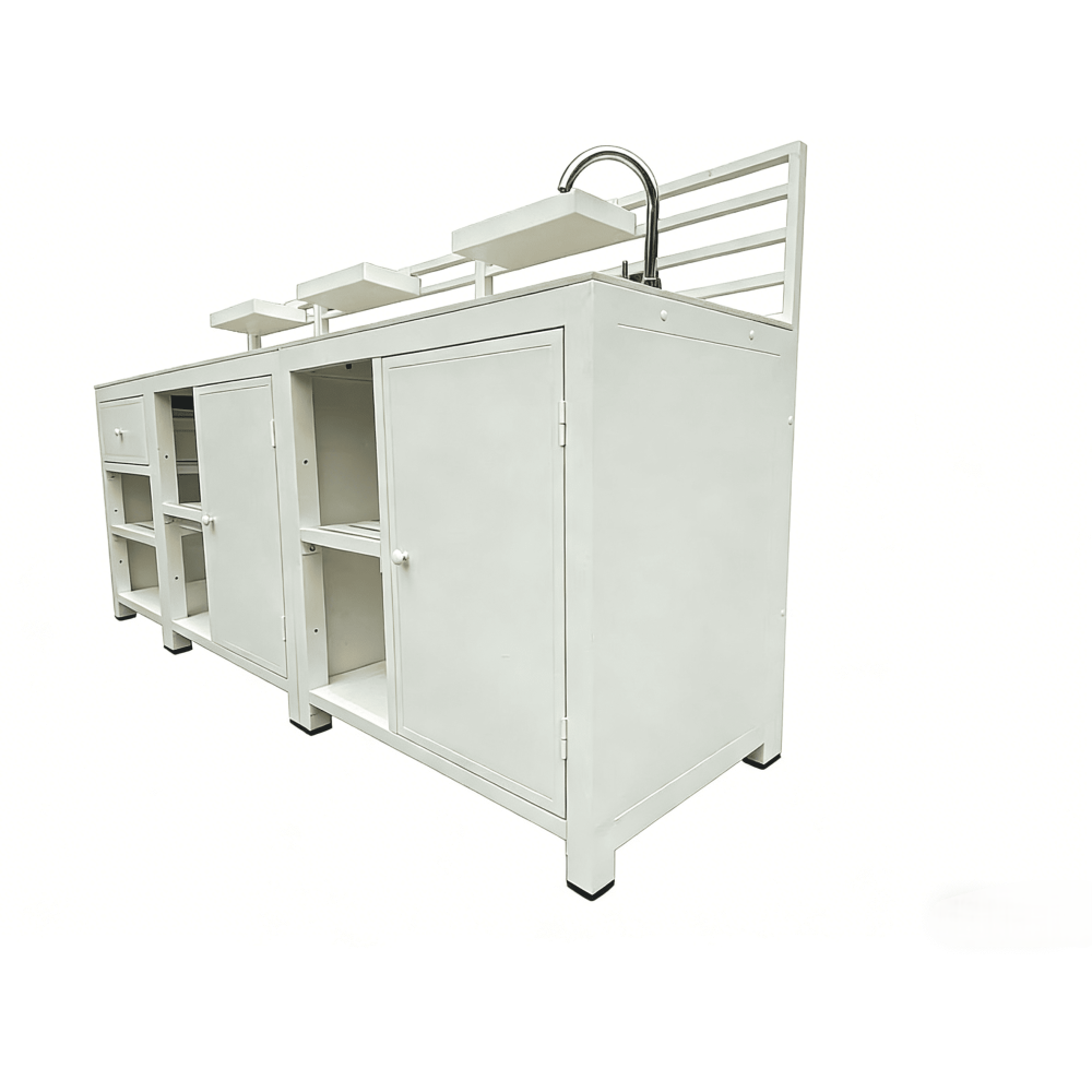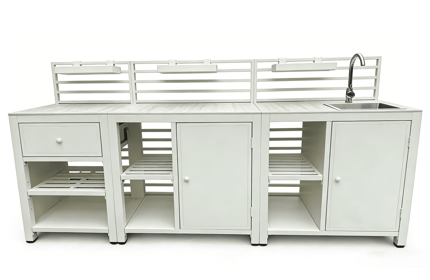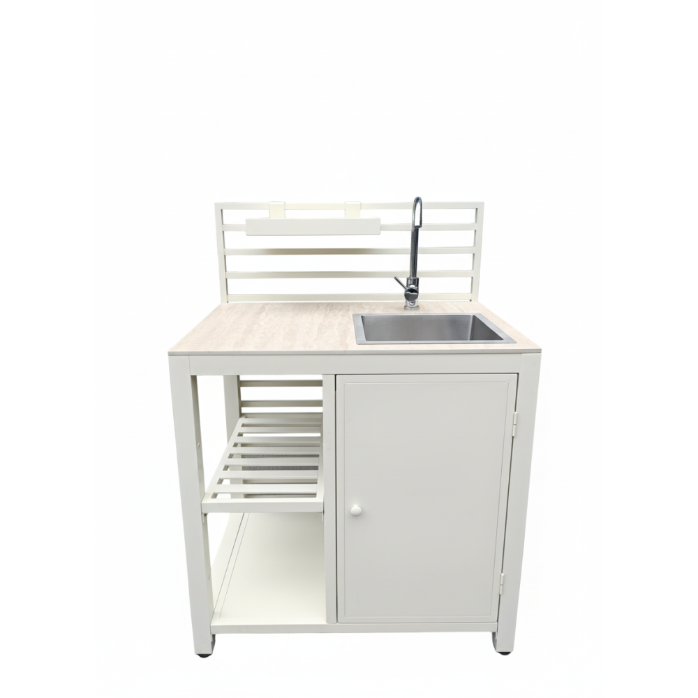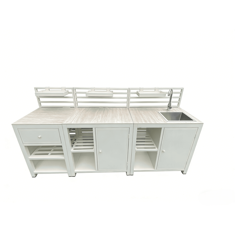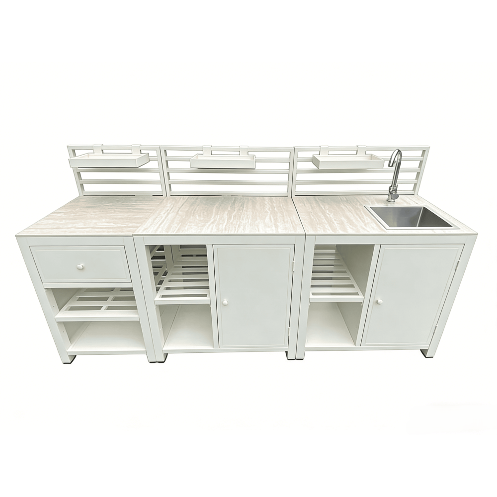 It visually resembles an interior kitchen, yet is fully engineered for outdoor performance.