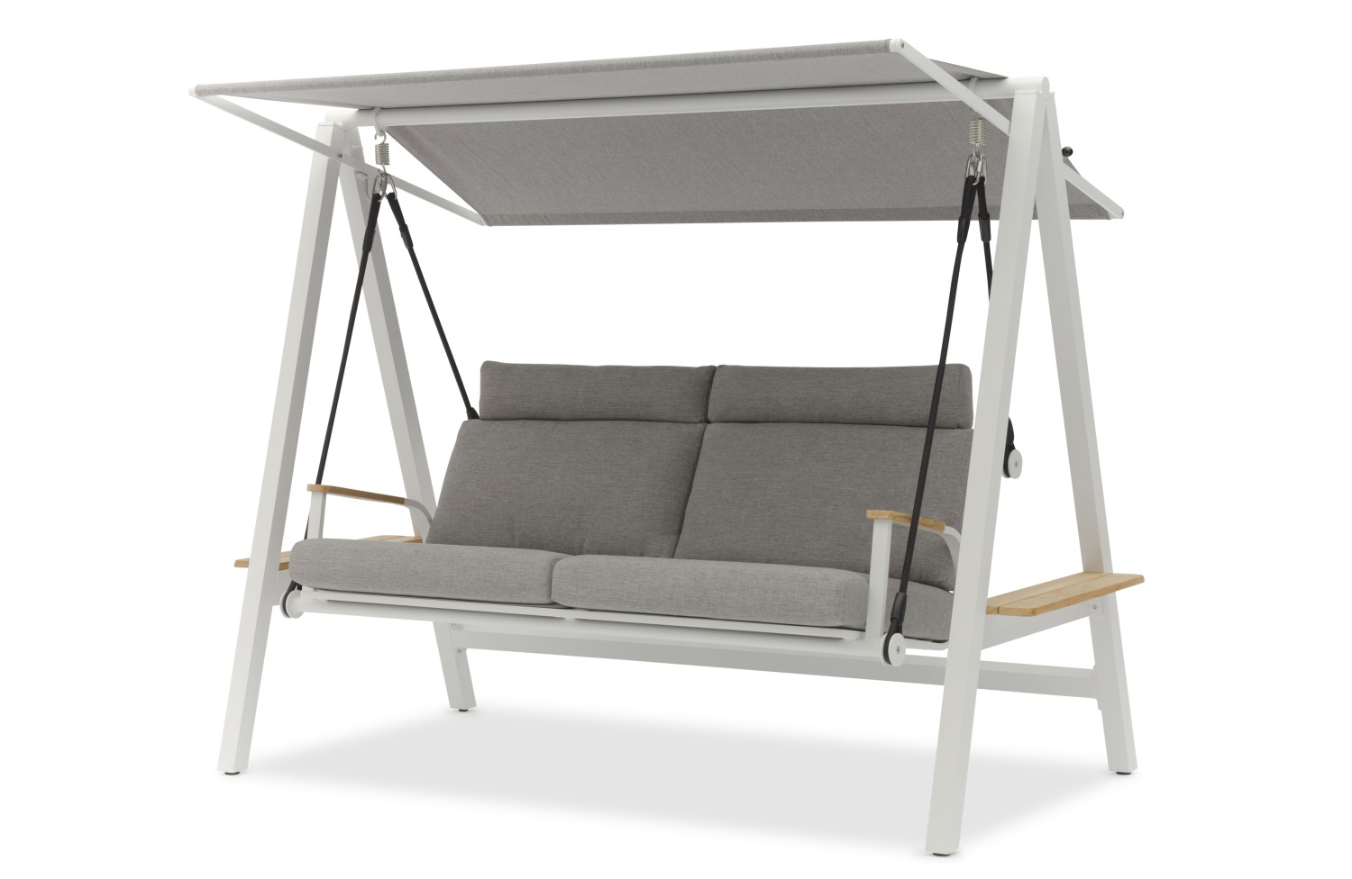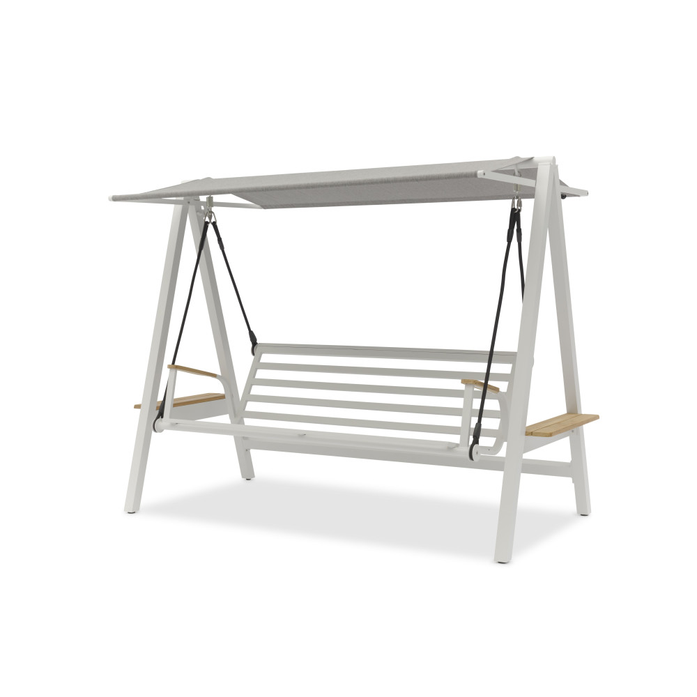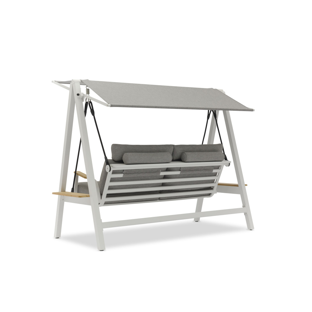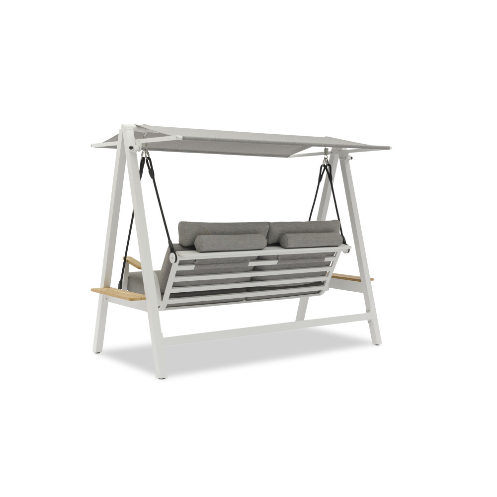 Modern garden swings in a classic style, combining aluminum and teak wood. The LAGOM swing, allowing you to experience a sense of lightness and weightlessness. Thanks to their compact design, they easily fit on a summer terrace, possibly by a swimming pool or on a beach overlooking the sea. The waterproof fabric used in this collection is easy to maintain. Special attention should be paid to the cushion, as it is a key element of comfort.
