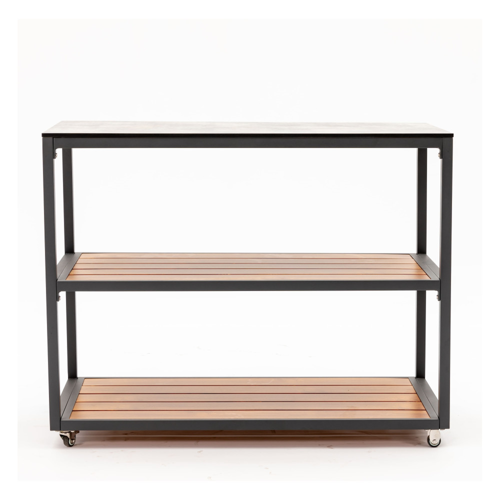 Blaty: naturalny teak lub spiek kwarcowy (sintered stone) z efektem marmuru — odporne na wysoką temperaturę, UV i uszkodzenia mechaniczne