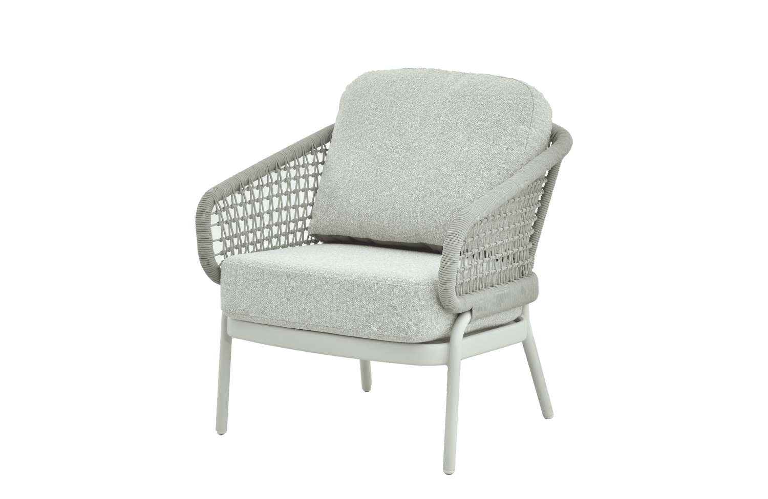 Oparcie i siedzisko ozdobione są dekoracyjnym splotem z wytrzymałych lin, co nadaje konstrukcji lekkości i elegancji.