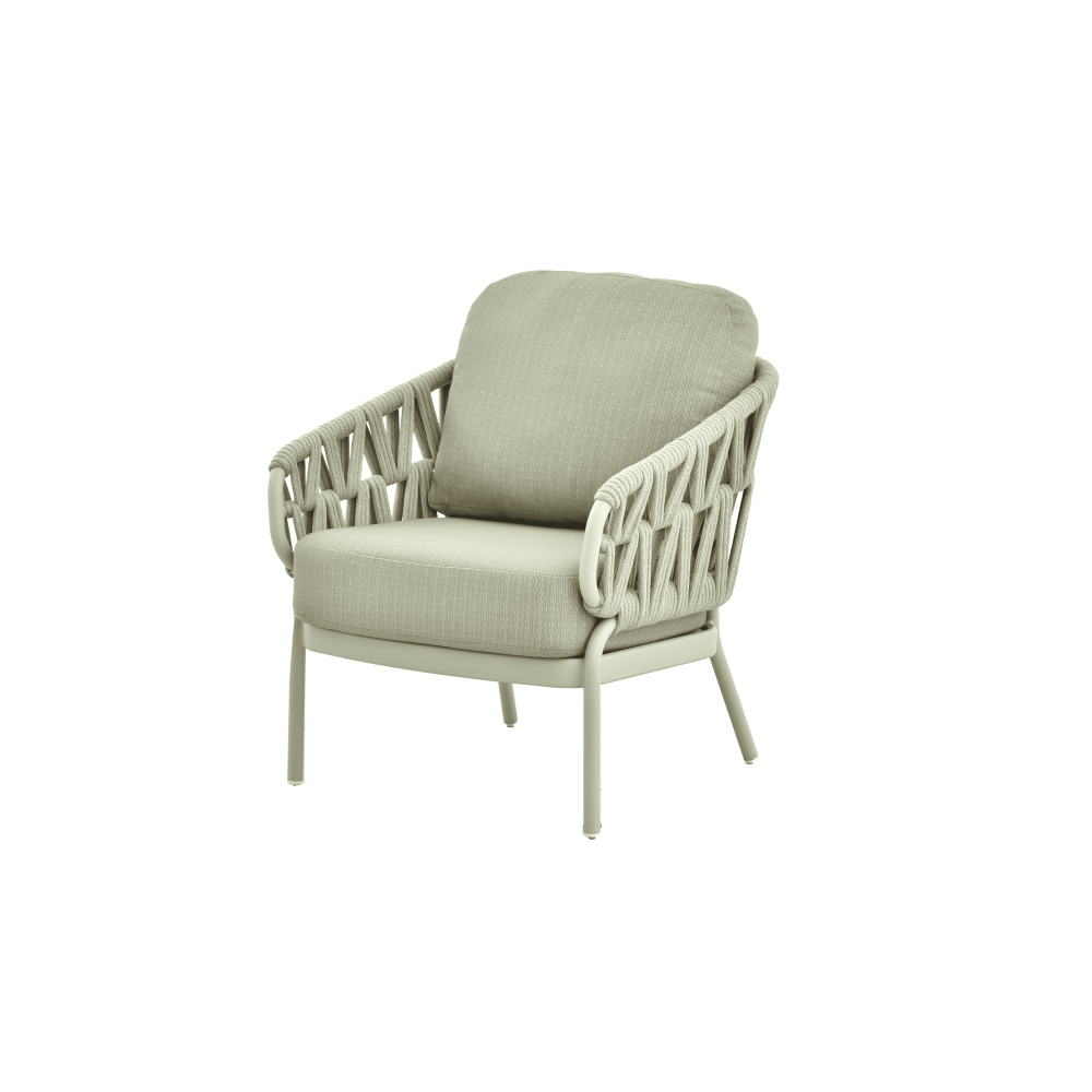Oparcie i siedzisko zostały ozdobione dekoracyjnym splotem z wytrzymałych lin, co nadaje konstrukcji lekkości i elegancji.