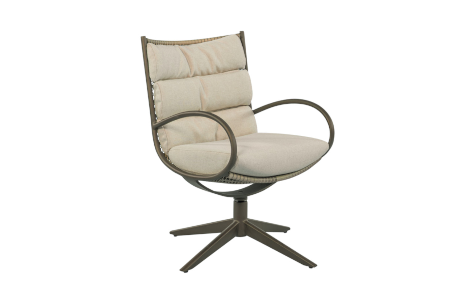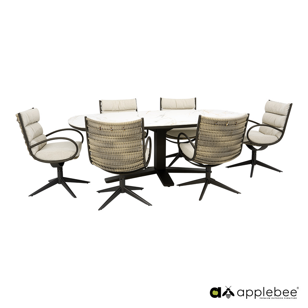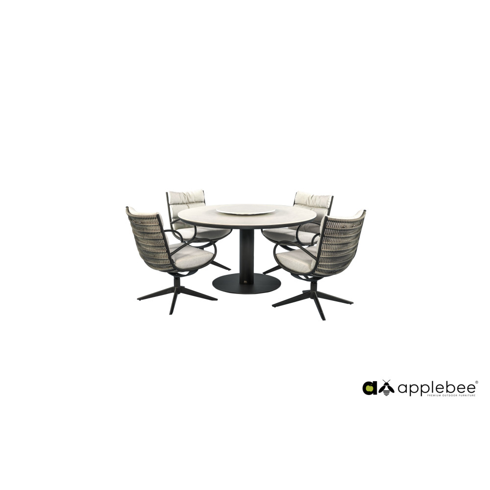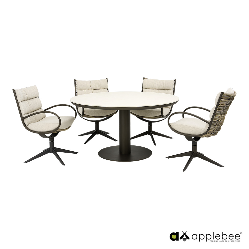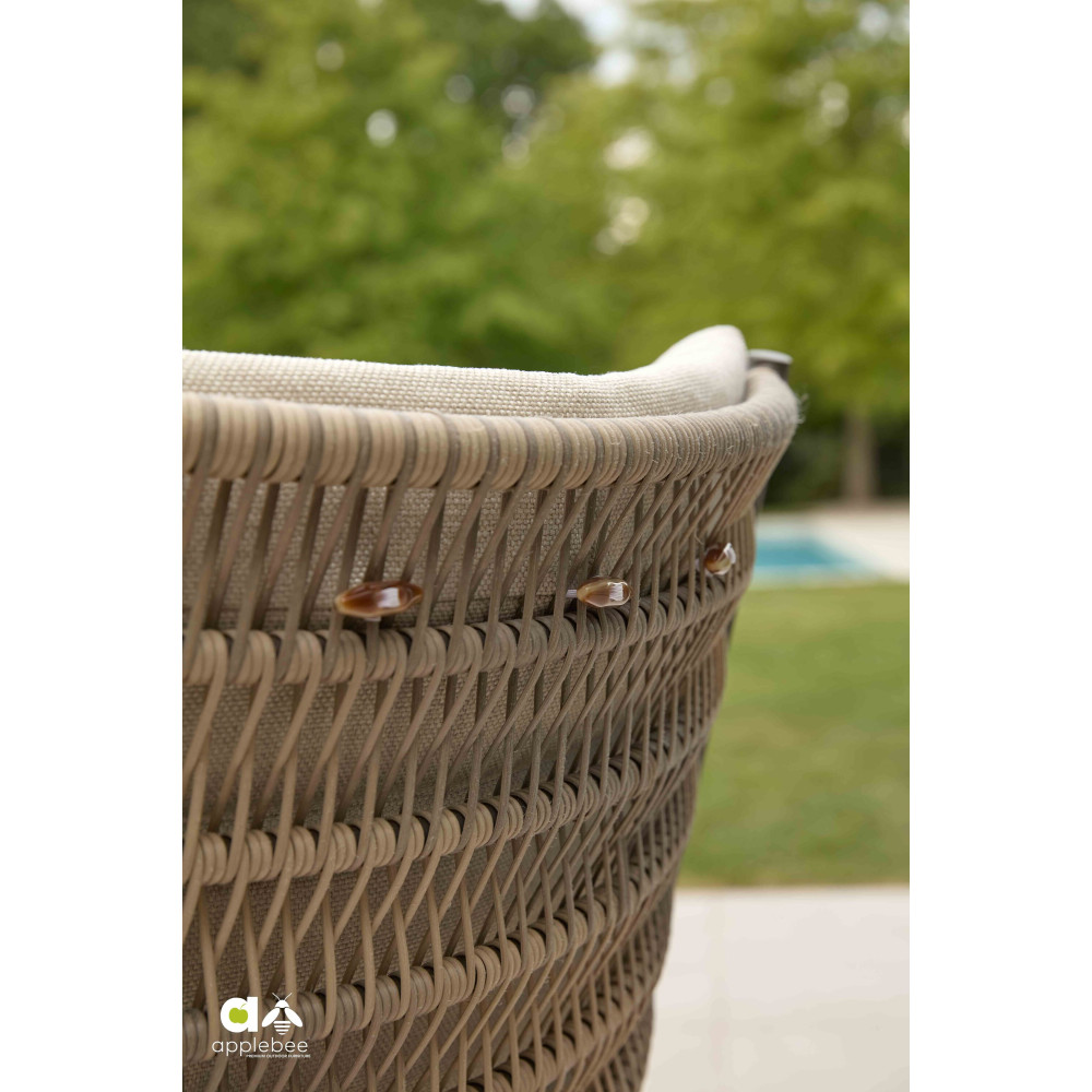 CAMP BAY lounge-dining chair wyposażony jest w obrotową podstawę, co pozwala łatwo siadać i wstawać bez przesuwania krzesła. Konstrukcja wykonana jest z wysokiej jakości metalu i uzupełniona eleganckim otwartym splotem Biculair®, który nadaje produktowi lekki i przestrzenny wygląd.