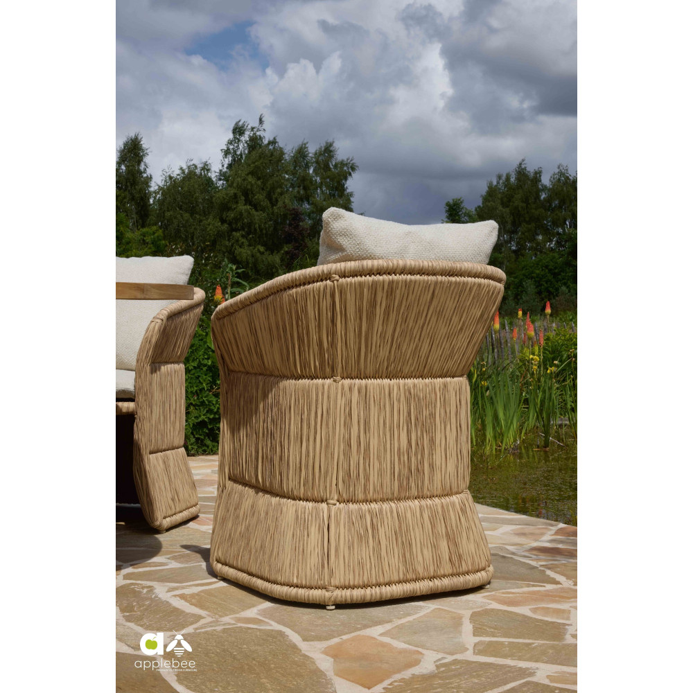 Dzięki plecionce Twisted Leaf krzesło zyskuje wyrazisty, naturalny i lekko rustykalny wygląd, tworząc relaksującą i przytulną atmosferę. Miękkie poduszki wykonane są z luksusowej tkaniny Bouclé Cream i wypełnione innowacyjnym materiałem Bee Wett®, który zapewnia komfort i odporność na warunki atmosferyczne.