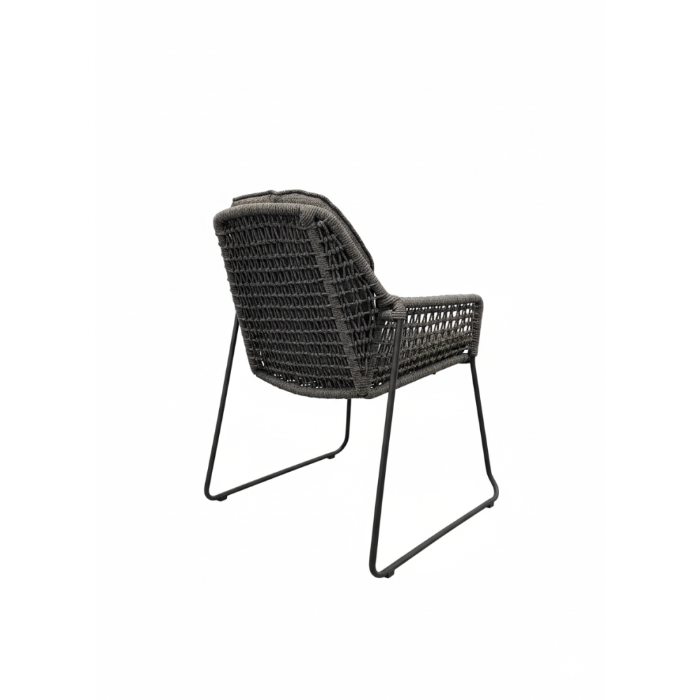 Oparcie i siedzisko ozdobione są dekoracyjnym splotem z wytrzymałych lin, co nadaje konstrukcji lekkości i elegancji.