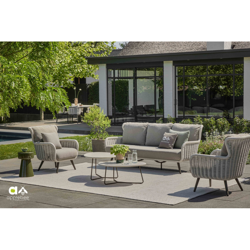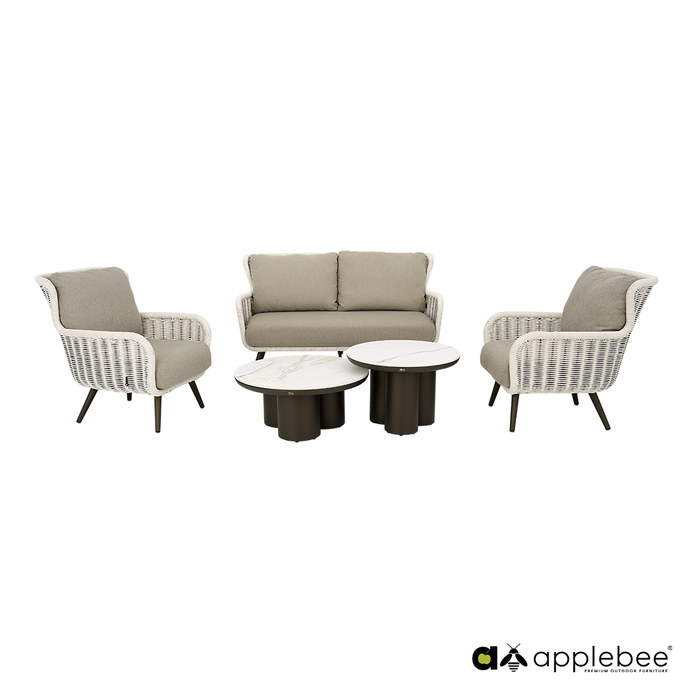 Key Largo od Apple Bee to połączenie ciepłego odcienia Bronze, jasnej plecionki Biculair® Twisted Ivory oraz eleganckich blatów z sintered stone marble — tworzące trwałą i stylową strefę lounge w nowoczesnej przestrzeni outdoor.