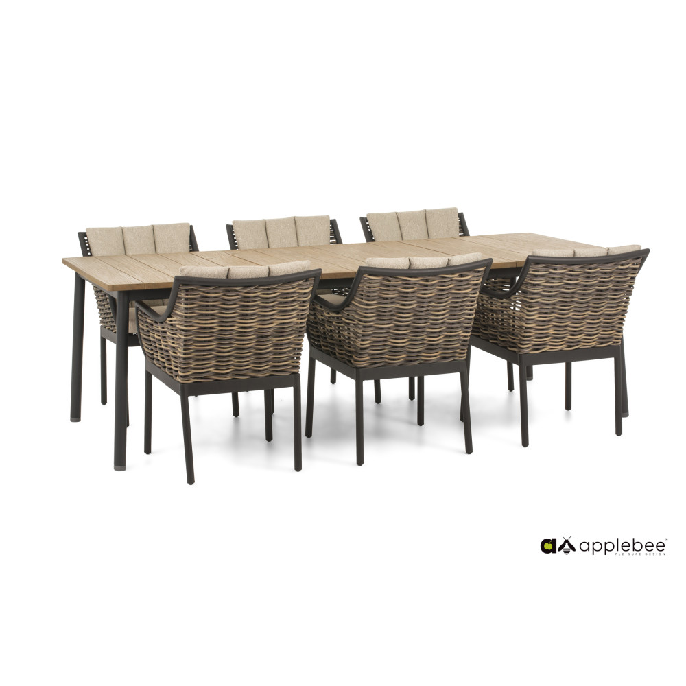 Ogromny sukces zestawu wypoczynkowego Apple Bee Milou doprowadził do stworzenia odpowiedniego zestawu obiadowego. Projektant Sako rozpoczął pracę nad tym projektem i tak powstał zestaw obiadowy Milou. Kolekcję Milou wyróżnia plecionka z wikliny, która wygląda jakby była utkana z gałęzi wierzby. Stół obiadowy jest dostępny z blatem z lekkiego betonu lub drewna tekowego SVLK. Poduszki w tym zestawie ogrodowym są wykonane w technologii BEE WETT® i podtrzymywane przez czarną aluminiową ramę.