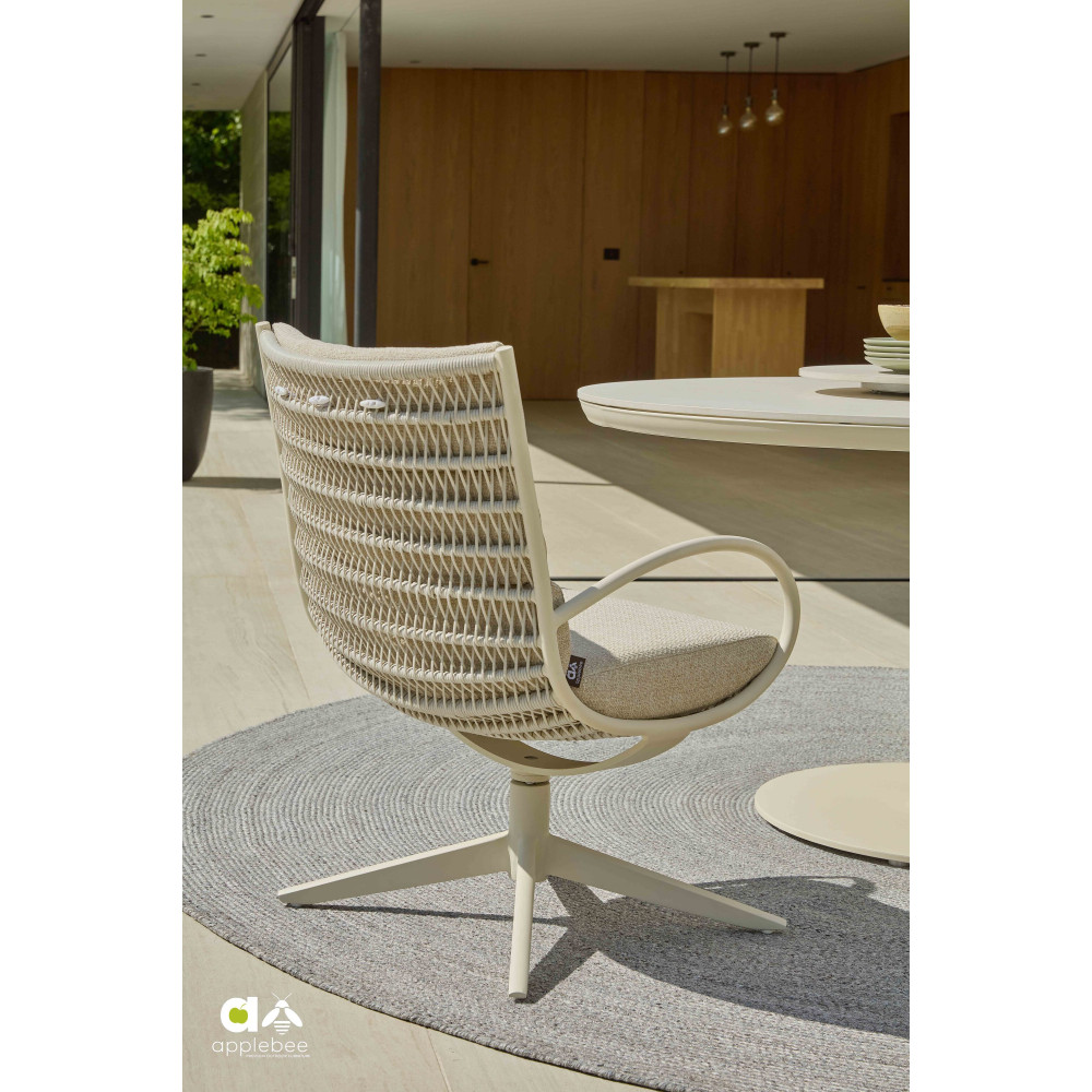 CAMP BAY lounge-dining chair wyposażony jest w obracaną podstawę, co pozwala łatwo wsiadać i wstawać, bez przesuwania krzesła. Konstrukcja wykonana jest z wysokiej jakości metalu i uzupełniona delikatnym otwartym plecionym splotem Biculair®, który nadaje produktowi lekkości i powietrznego wyglądu.