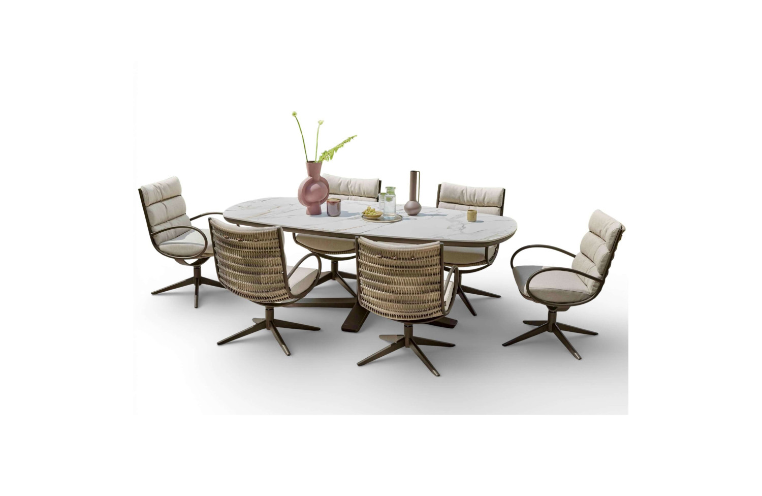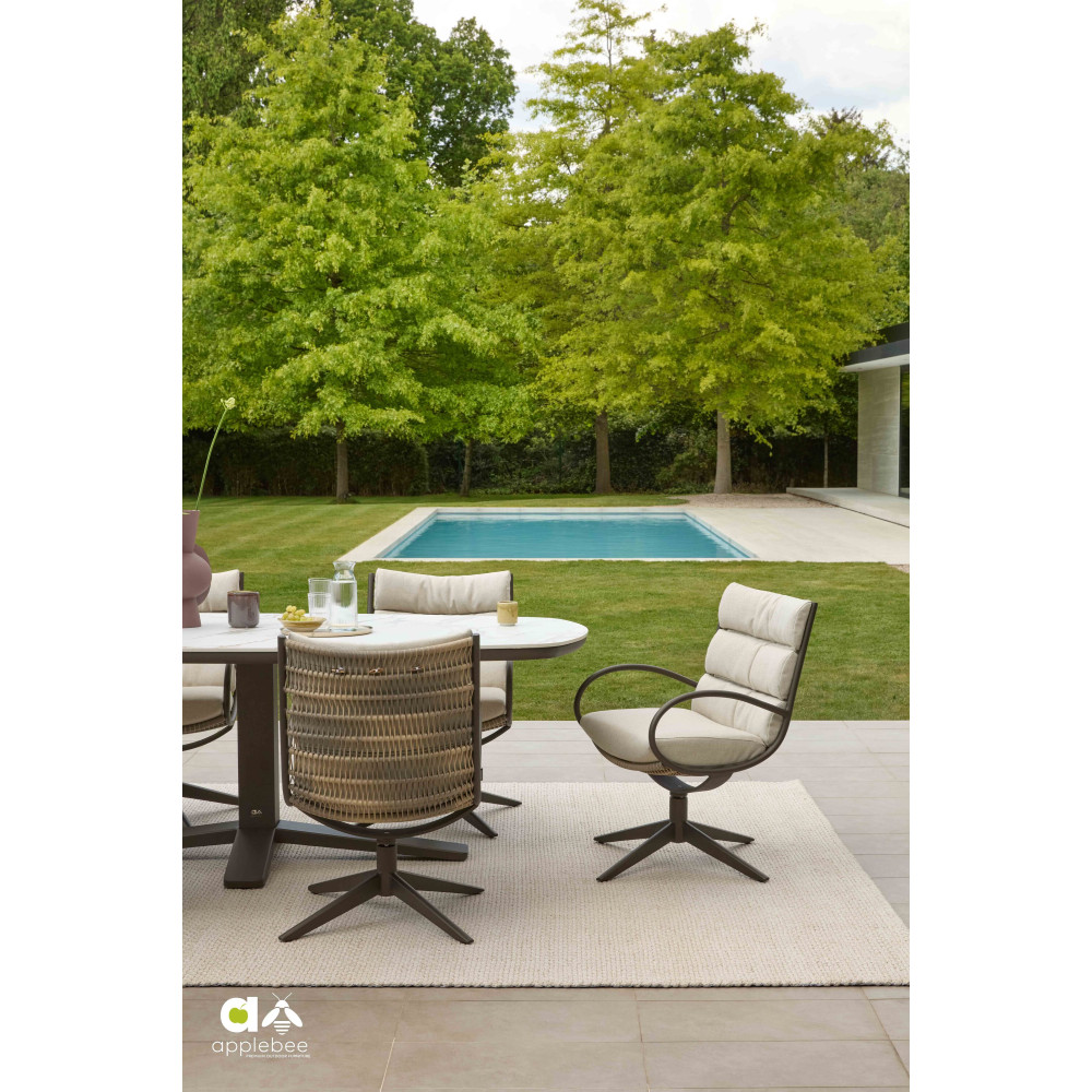 Zanzibar doskonale komponuje się z krzesłami jadalnianymi Apple Bee — zarówno z modelami z plecionką rope, jak i minimalistycznymi wariantami aluminiowymi. Dzięki uniwersalnemu designowi stół łatwo wpisuje się w nowoczesne tarasy prywatnych domów, miejskie patio czy projekty HoReCa.