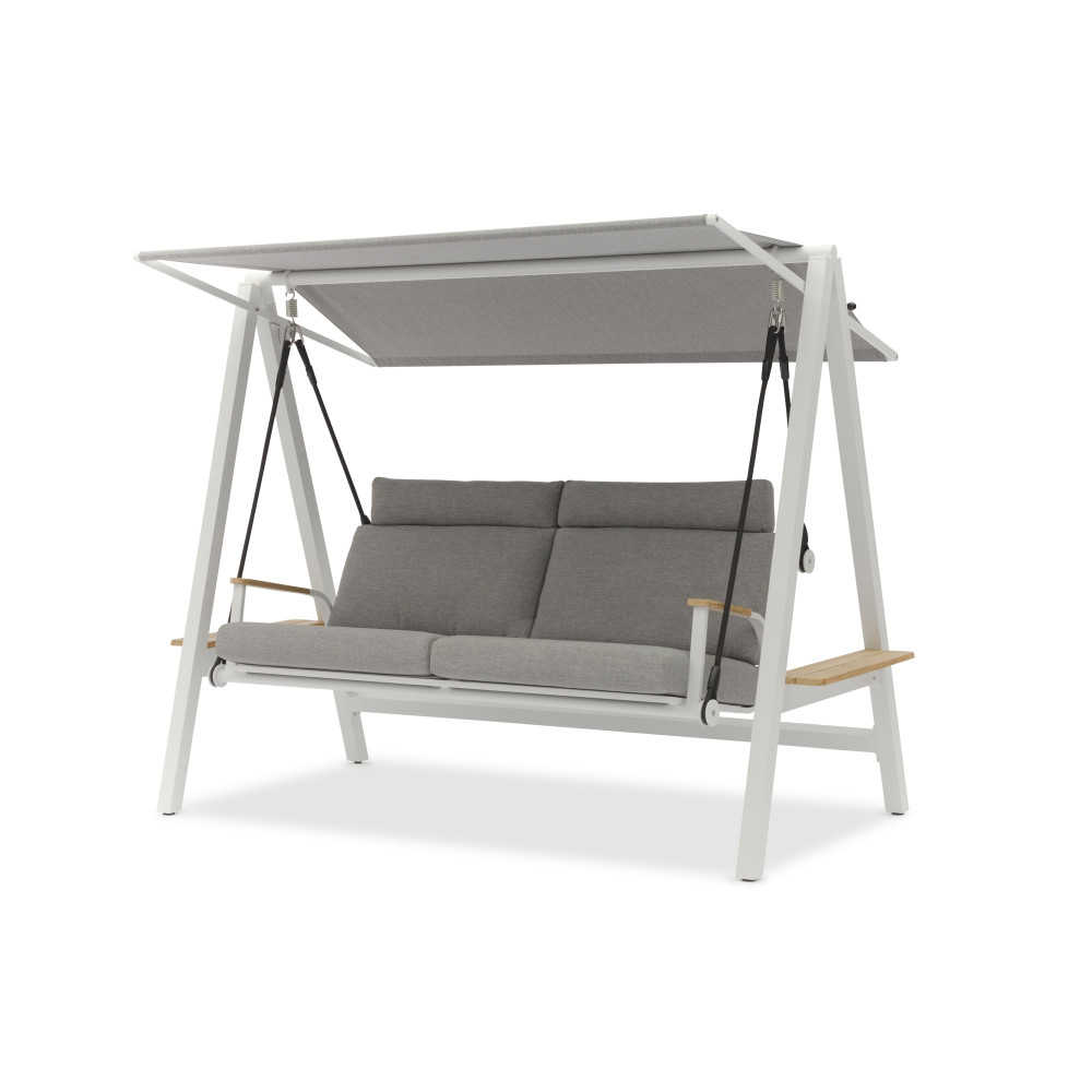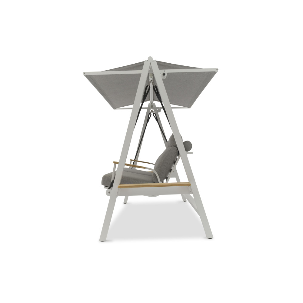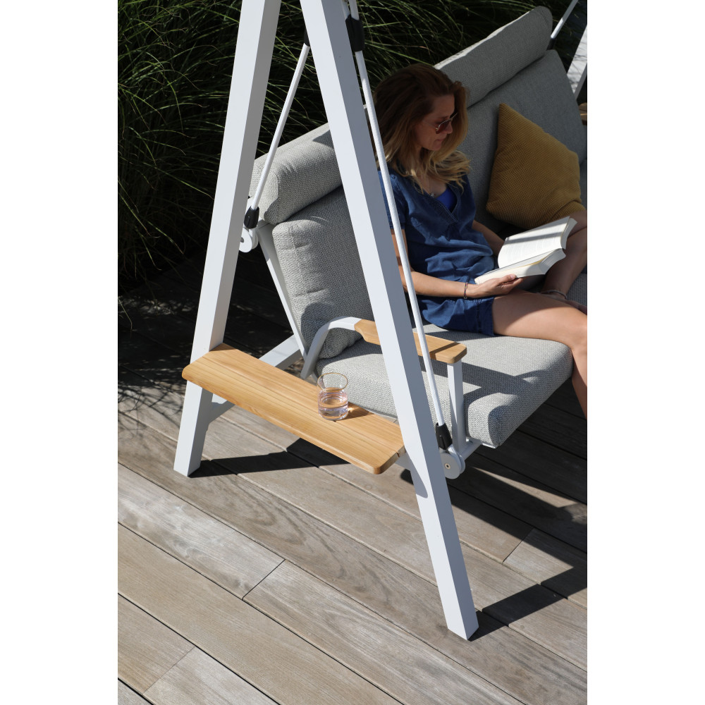 Nowoczesne huśtawki ogrodowe w klasycznym stylu, łączące aluminium i drewno tekowe. Huśtawka LAGOM, dzięki której poczujesz lekkość i nieważkość.