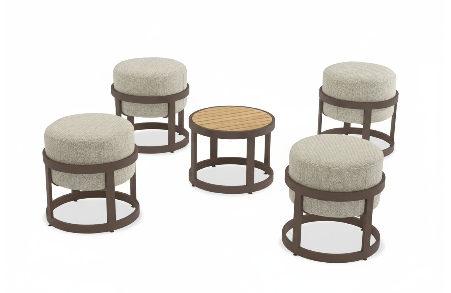 Modułowy zestaw do wypoczynku na tarasie lub balkonie. W skład zestawu wchodzą: 4 pufy i stolik z powierzchnią z drewna tekowego i aluminiową ramą. Stolik i pufy można składać jeden na drugi.