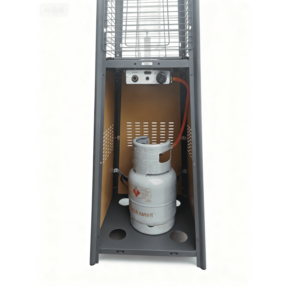 Konstrukcja stolika przewiduje dyskretne miejsce na butlę gazową, dzięki czemu całość pozostaje estetyczna i uporządkowana.