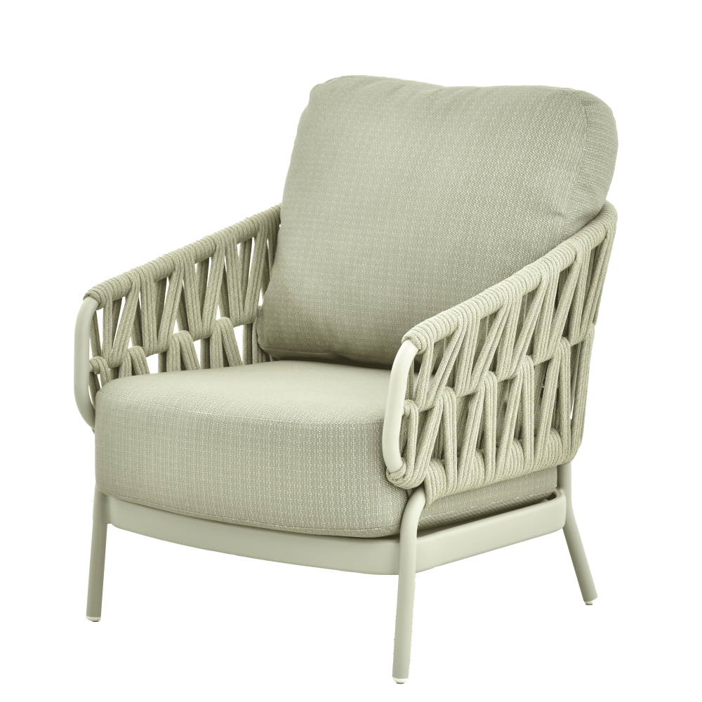 Oparcie i siedzisko zostały ozdobione dekoracyjnym splotem z wytrzymałych lin, co nadaje konstrukcji lekkości i elegancji.