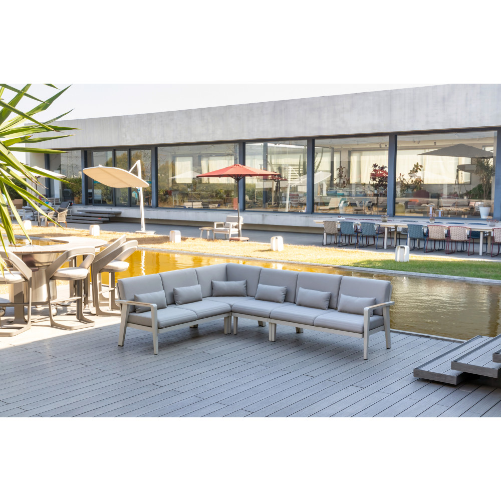 Centralny element, za pomocą którego można stworzyć narożną sofę. Seria Emoti z wysokiej jakości aluminium i nieskończonymi możliwościami tworzenia i łączenia stref wypoczynkowych. Bez wysiłku stwórz wygodną grupę sof lub przyjemną jadalnię tak, jak chcesz. Stoły obiadowe są dostępne w różnych kształtach i rozmiarach, które w połączeniu z wygodnymi fotelami pozwalają stworzyć przytulną atmosferę. Główna konstrukcja jest sztywna, ale dzięki miękkim poduszkom z tkaniny Olefin jest znacznie bardziej miękka.