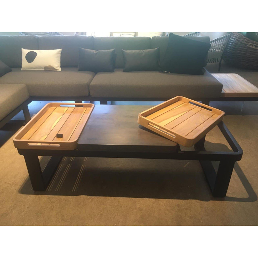 Firma Apple Bee stworzyła coś wyjątkowego, zupełnie nowego, a wygląd zestawu Mura jest inspirujący. Zestaw Mura jest wyjątkowy pod względem wszystkich rozwiązań projektowych, najwyższej klasy materiałów i stanowi funkcjonalne uzupełnienie Twojego ogrodu. Mura Lounge to zestaw modułowy, który można skompletować według własnego gustu. Funkcjonalna jest nie tylko modułowa sofa, ale także stolik kawowy, który nie ustępuje jej pod względem uniwersalności. Stolik z blatem z lekkiego betonu pośrodku jest wyposażony w dwa zdejmowane tace z drewna tekowego po bokach. Bardzo wygodne, na przykład do podawania posiłków i napojów! Można też postawić tacę z napojami na ławce, aby zapewnić stabilność i mieć wszystko pod kontrolą. Dzięki czarnej aluminiowej ramie i szarym poduszkom Bee Wett® w kolorze „Bazalt” ten zestaw w neutralnych kolorach z łatwością wkomponuje się w każdą przestrzeń przydomową!