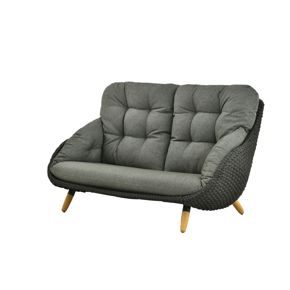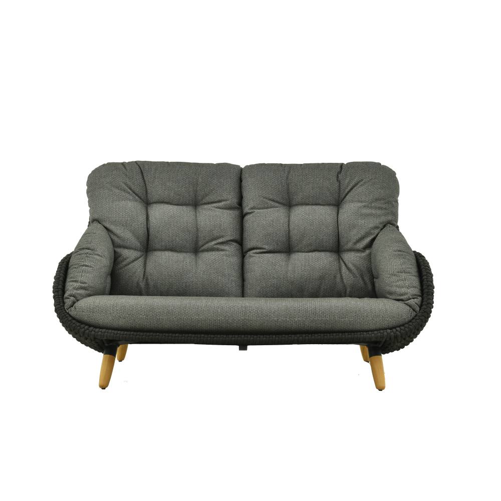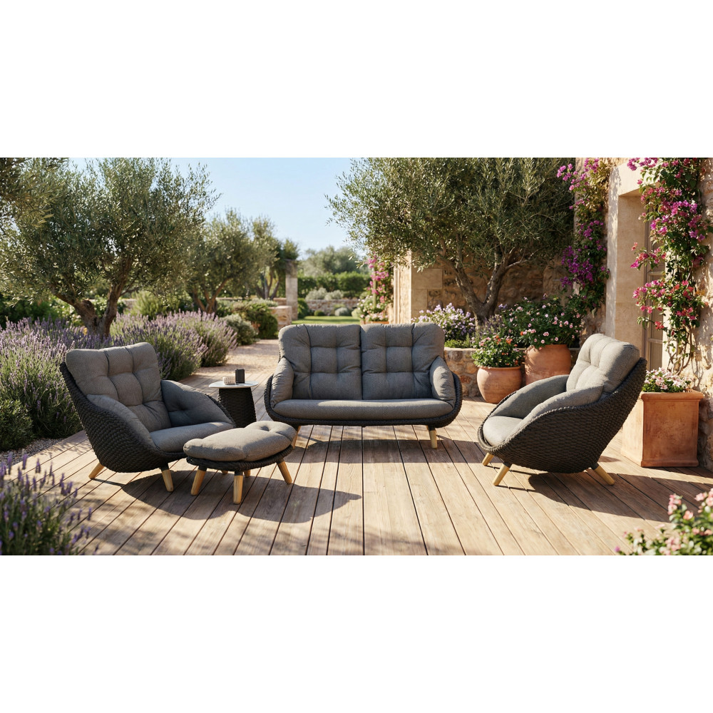 Tapicerka z tkaniny Sunproof® gwarantuje odporność na blaknięcie i wilgoć, natomiast wstawki z naturalnego drewna tekowego dodają kolekcji ciepła i przytulności, równoważąc chłód metalu.