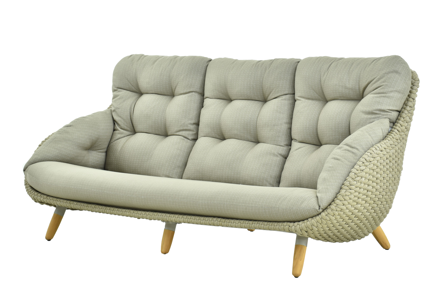 Tapicerka z tkaniny Sunproof® gwarantuje odporność na blaknięcie i wilgoć, natomiast wstawki z naturalnego drewna tekowego dodają kolekcji ciepła i przytulności, równoważąc chłód metalu.
