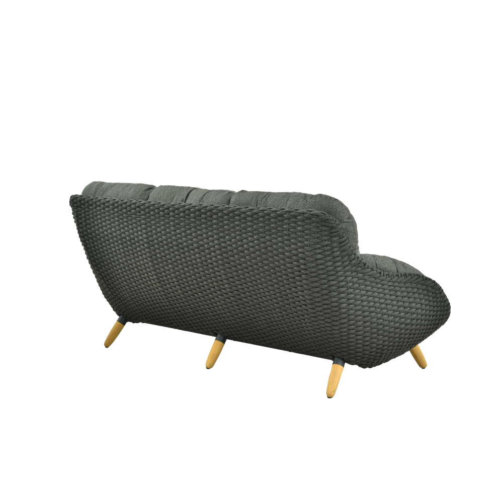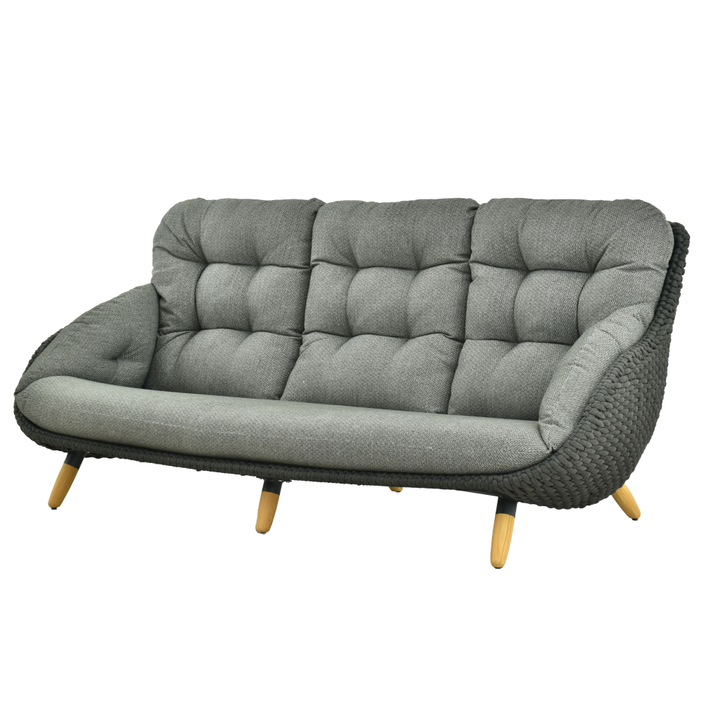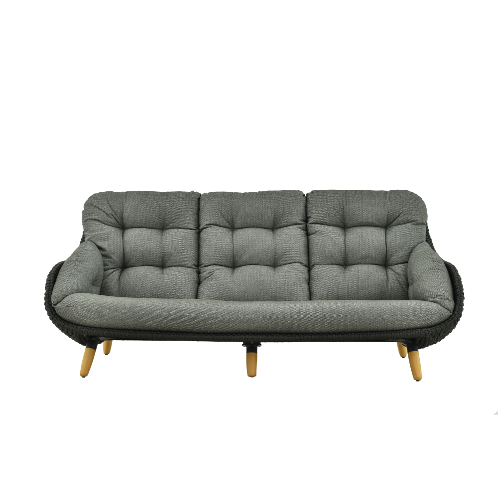 Tapicerka z tkaniny Sunproof® gwarantuje odporność na blaknięcie i wilgoć, natomiast wstawki z naturalnego drewna tekowego dodają kolekcji ciepła i przytulności, równoważąc chłód metalu.