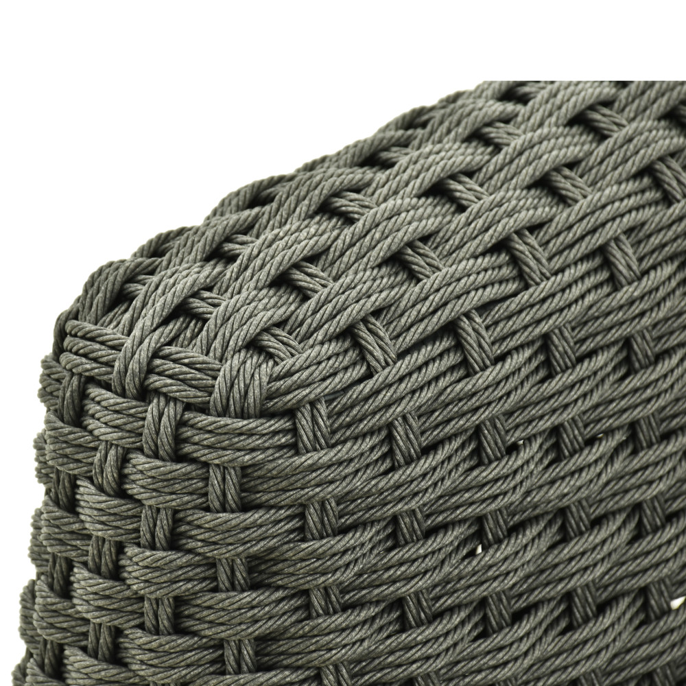 Solidna, a zarazem wizualnie lekka konstrukcja wykonana jest z aluminium pokrytego proszkowo, co zapewnia trwałość i odporność na korozję oraz promieniowanie UV. Oparcie z plecionki z akrylowej nici nadaje meblom graficzny charakter i wygodne podparcie.
