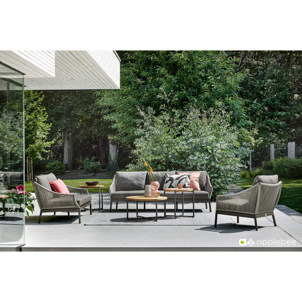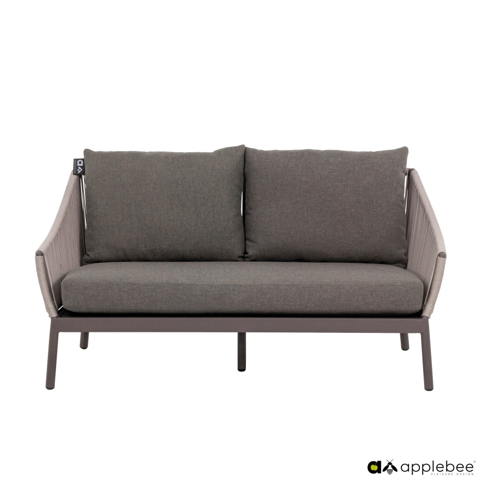 Ten stylowy zestaw wypoczynkowy to nowość w kolekcji Apple Bee na rok 2022. Obtoki Bijou Lounge wyróżnia się dwuwarstwową plecionką, przez którą można patrzeć. Liny wokół aluminiowej ramy pozostawiają otwarte rogi, odsłaniając szaro-brązowy kolor.