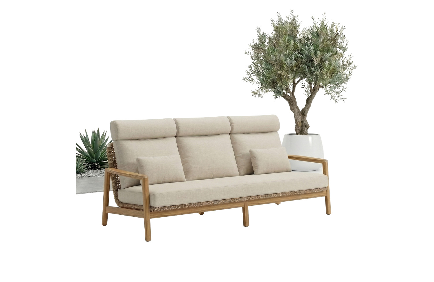 Sofa (z poduszkami) - posiada głębokie siedzisko, teakową powierzchnię podłokietników, aluminiowa konstrukcja w połączeniu z miękkimi poduszkami sprawiają, że ta seria jest bardzo komfortowa, trwała i wyjątkowo stylowa. Kolekcja obejmuje zestaw sofowy oraz modułowy zestaw narożny. Można dobrać idealny zestaw do Twojego tarasu. "Sun Art" - to najnowocześniejszy wybór dla Twojej przestrzeni zewnętrznej.