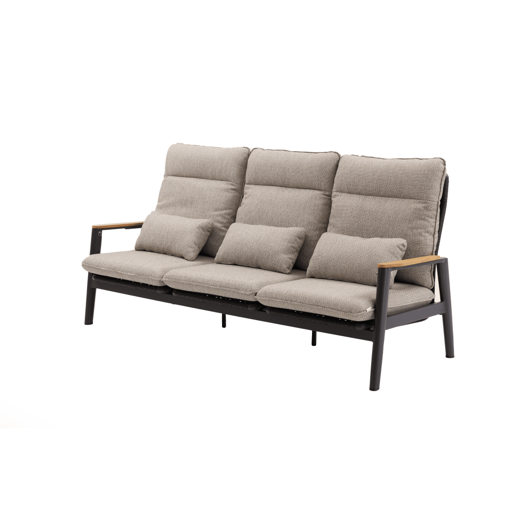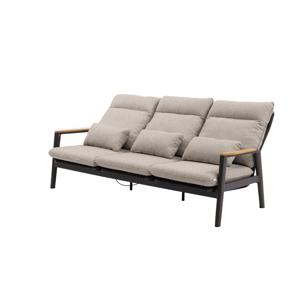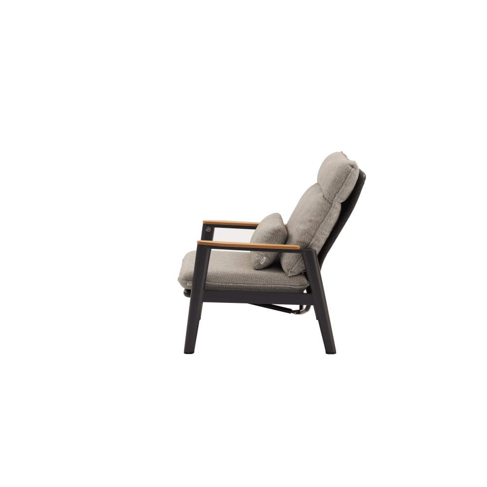 Rama ze stali nierdzewnej z powłoką proszkową w kolorze beżowym została uzupełniona o eleganckie detale z drewna tekowego na podłokietnikach, nadające całości ciepły i ekskluzywny charakter.
