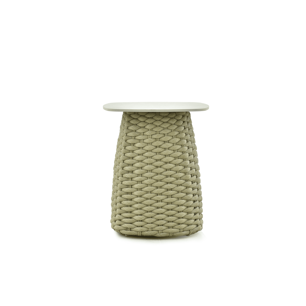 Solidna, a zarazem wizualnie lekka konstrukcja wykonana jest z aluminium malowanego proszkowo, co zapewnia trwałość, odporność na korozję oraz promieniowanie UV. Oparcie z plecionki z akrylowej nici nadaje meblom graficzny charakter oraz wygodne podparcie.
