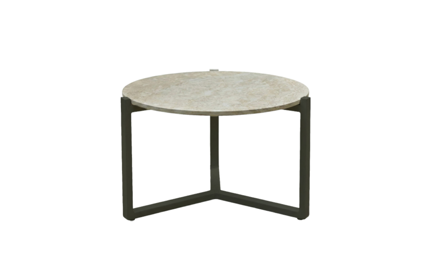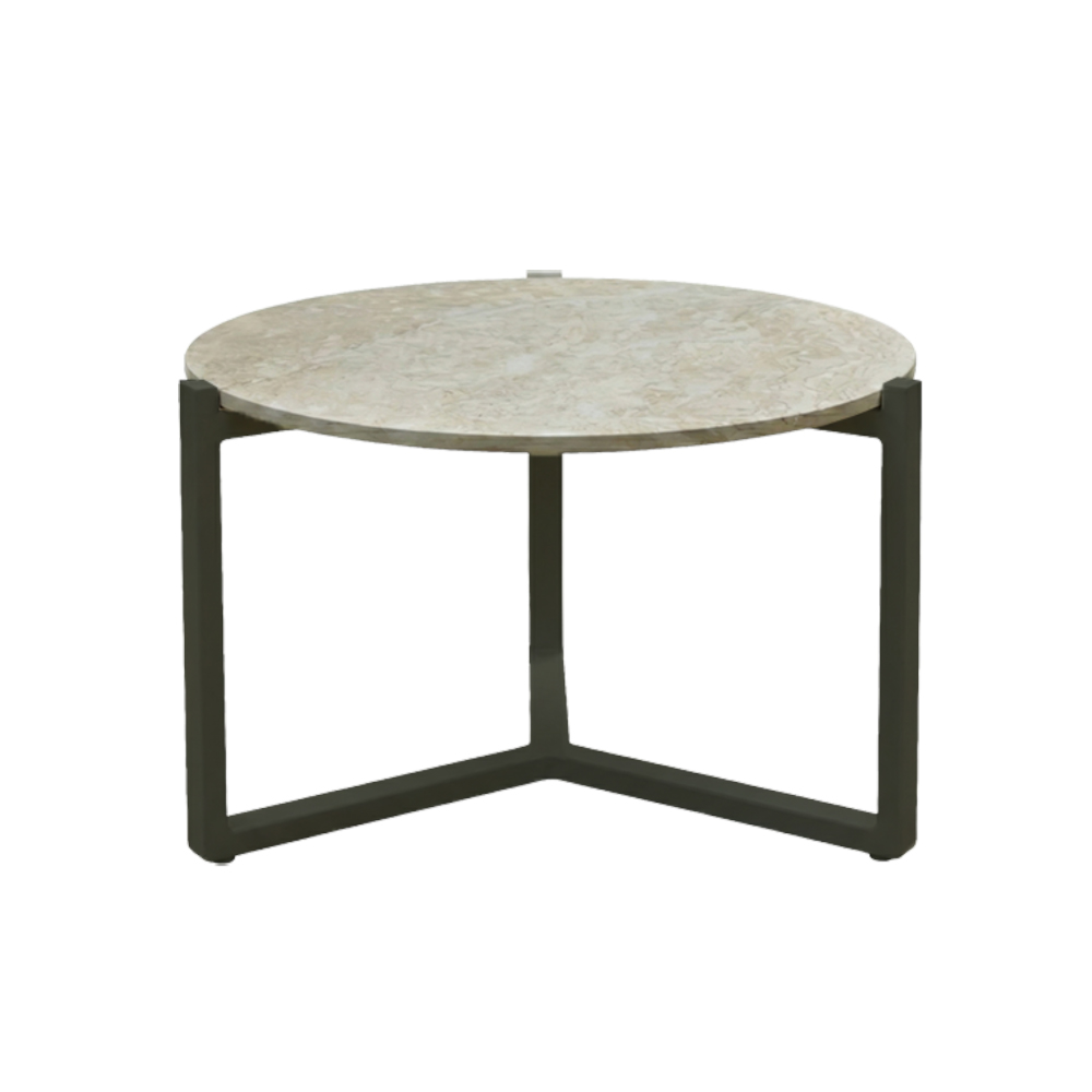 Podstawa wykonana jest z aluminium malowanego proszkowo w kolorach Black lub Oyster. Konstrukcja jest odporna na korozję i przystosowana do całorocznego użytkowania na zewnątrz. Kontrast między ciepłą fakturą teaku lub jasną powierzchnią kamienną a minimalistyczną metalową ramą nadaje stolikowi nowoczesny, uniwersalny charakter.