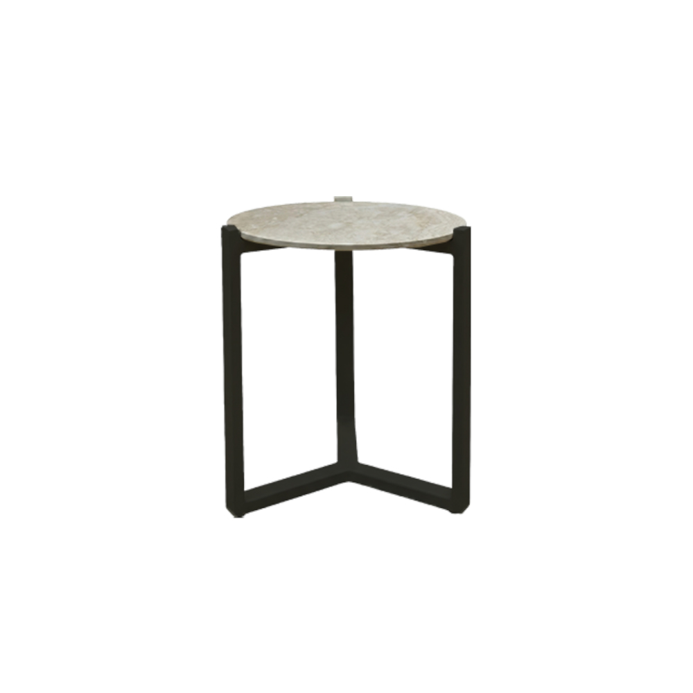 Podstawa wykonana jest z aluminium malowanego proszkowo w kolorach Black lub Oyster. Konstrukcja jest odporna na korozję i przystosowana do całorocznego użytkowania na zewnątrz. Kontrast między ciepłą fakturą teaku lub jasną powierzchnią kamienną a minimalistyczną metalową ramą nadaje stolikowi nowoczesny, uniwersalny charakter.
