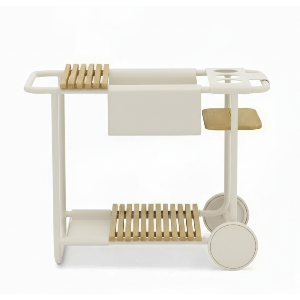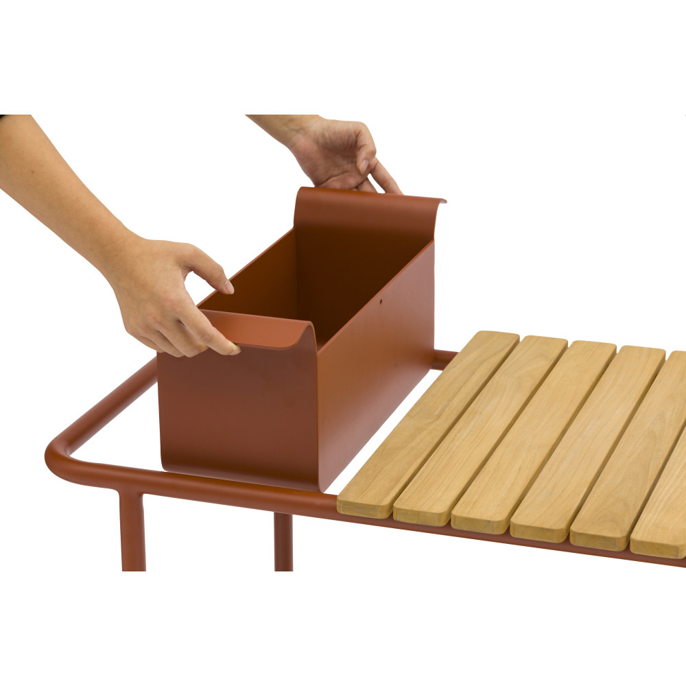 Siedziska posiadają zdejmowane pokrowce z tkaniny Sunproof®, która nie wchłania wody, szybko schnie i zachowuje kolor nawet w pełnym słońcu. Wstawki z naturalnego drewna tekowego dodają naturalnego ciepła i elegancji, harmonijnie łącząc się z nowoczesnymi formami.